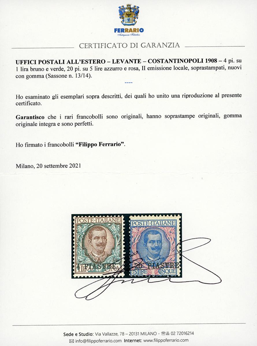 COSTANTINOPOLI 1908 - 4 p. su 1 lira, 20 p. su 5 lire II emissione locale (13/14), gomma originale integra, perfetti. Rari e di ottima qualità. Cert. Diena e Ferrario.