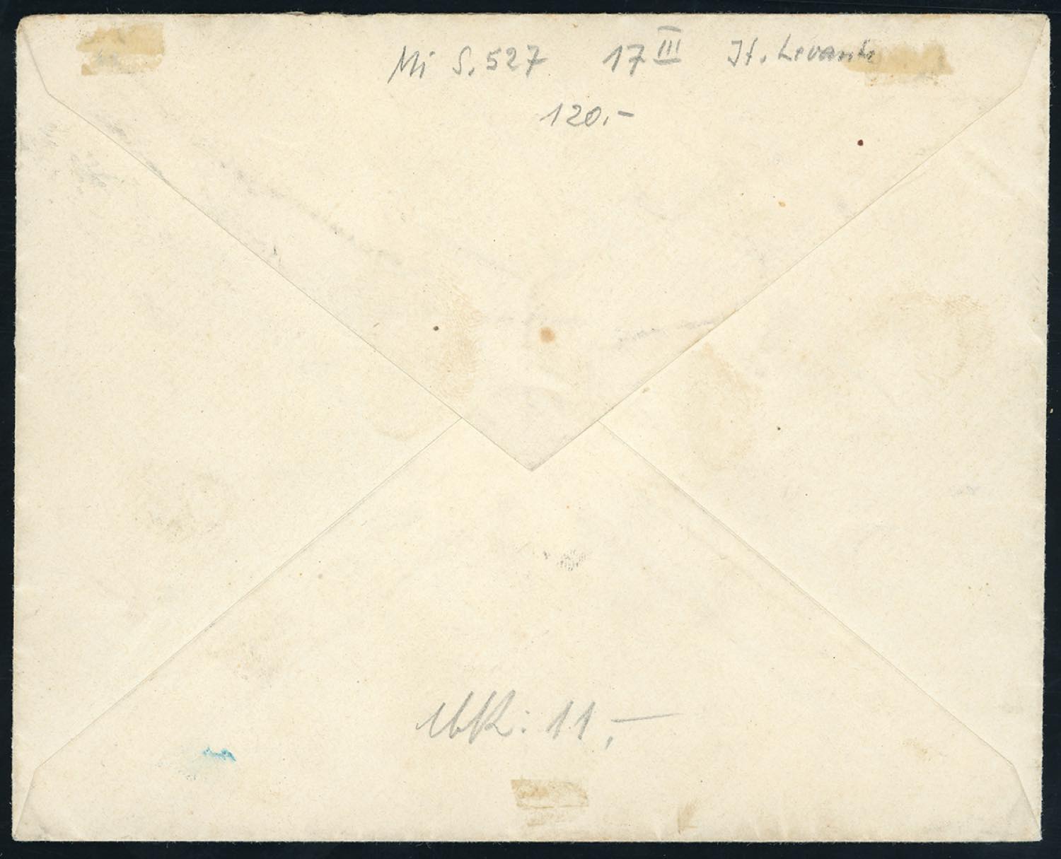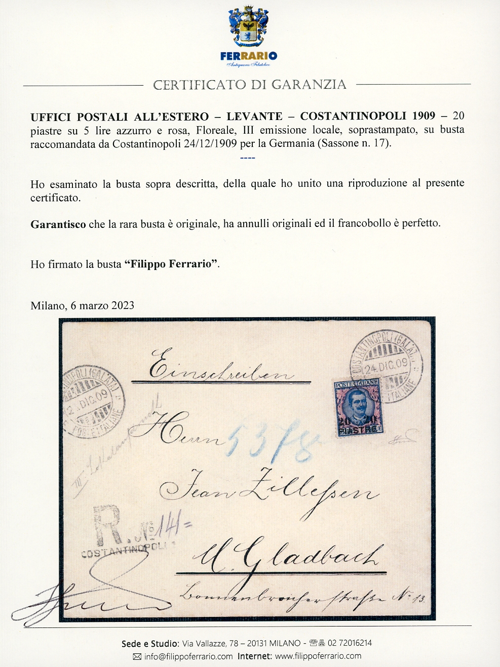 COSTANTINOPOLI 1909 - 20 piastre su 5 lire Floreale, III emssione locale (17), perfetto, isolato su busta raccomandata da Costantinopoli 24/12/1909 per la Germania. Molto rara. Cert. Ferrario.