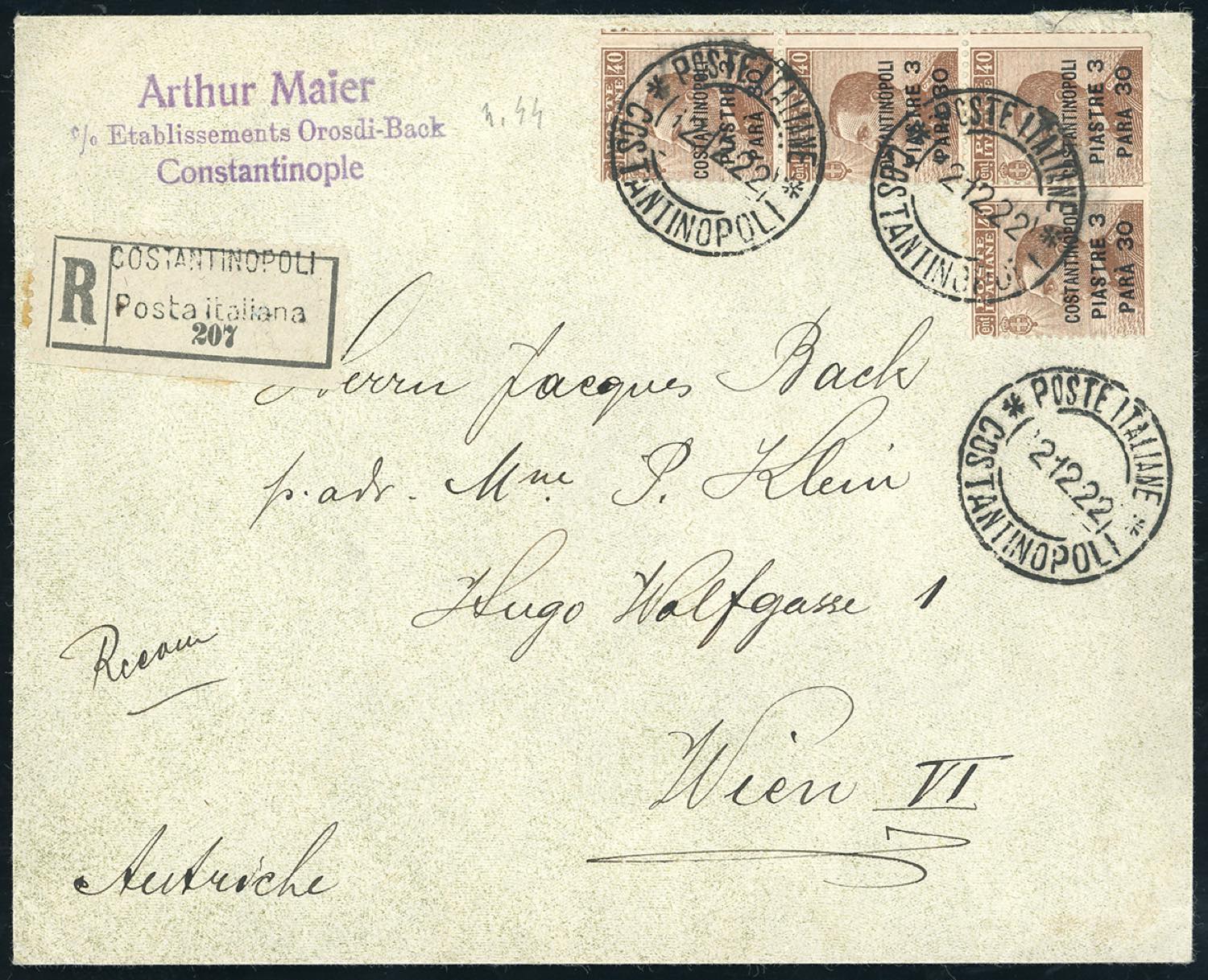 COSTANTINOPOLI 1922 - 3,30 pi. su 40 cent. (44), singolo e striscia di tre, perfetti, su busta raccomandata da Costantinopoli 2/12/1922 a Vienna. Non comune.