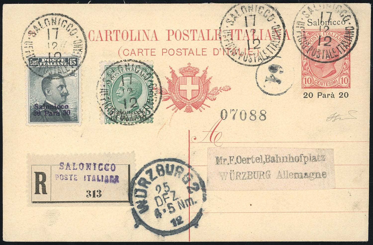 SALONICO INTERI POSTALI 1912 - 20 pa. su 10 cent., cartolina postale (Filagrano C11), integrata con 10 pa. su 5 cent. e 30 pa. su 15 cent. (1,3), perfetti, spedita per raccomandata da Salonicco 17/12/1912 per la Germania. Non comune. Ferrario.
