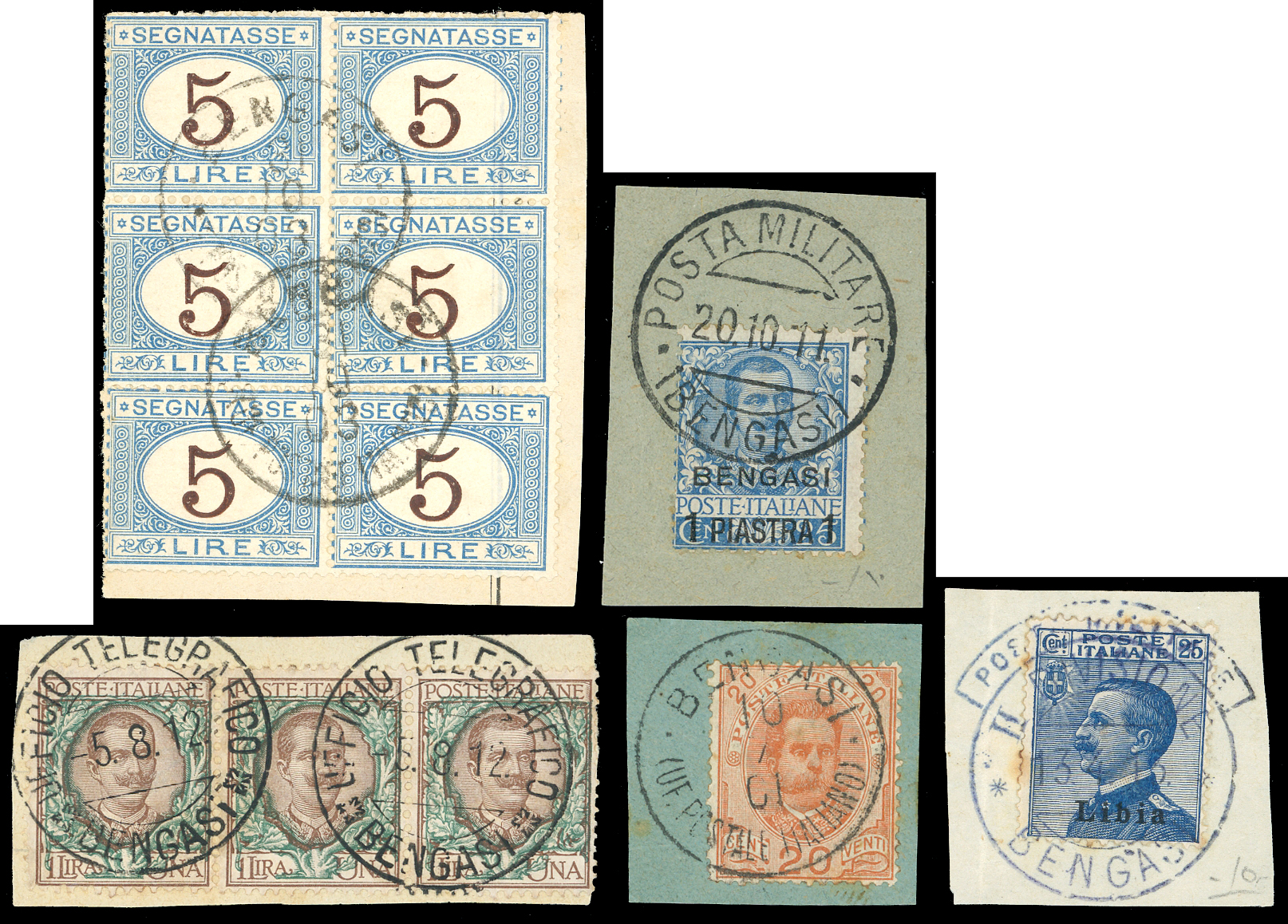 BENGASI 1901/1916 - Cinque frammenti con francobolli di Regno, Bengasi e Libia, tutti con differenti annulli di Bengasi. Interessante.