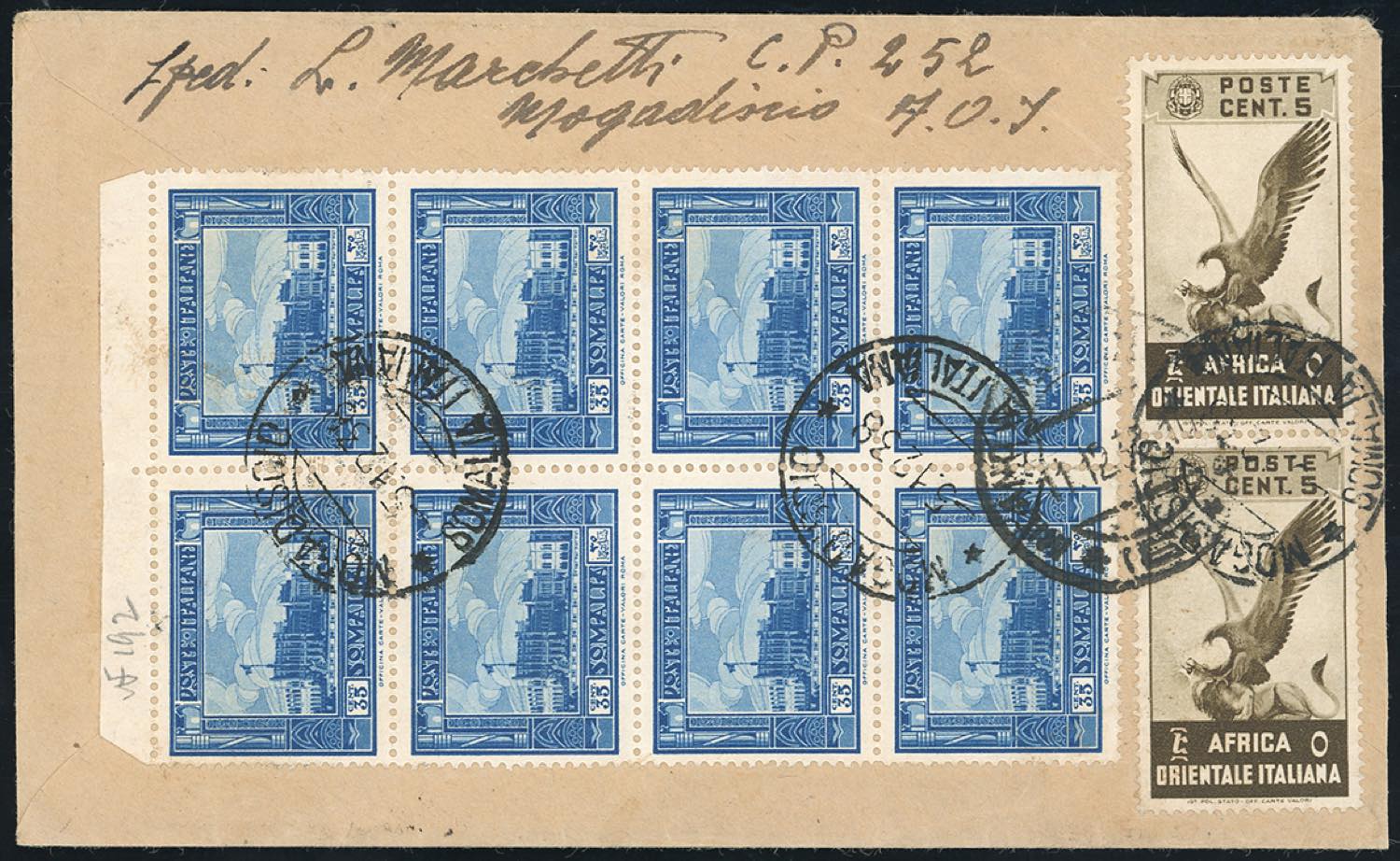 POSTA AEREA 1938 - 20 cent. e 60 cent. posta aerea Soggetti vari (7,A3), in affrancatura mista con 60 cent. posta aerea Soggetti Africani di Somalia (A19), perfetti, su aerogramma raccomandato da Mogadiscio 25/12/1938 a Milano. Bella combinazione di valori gemelli.