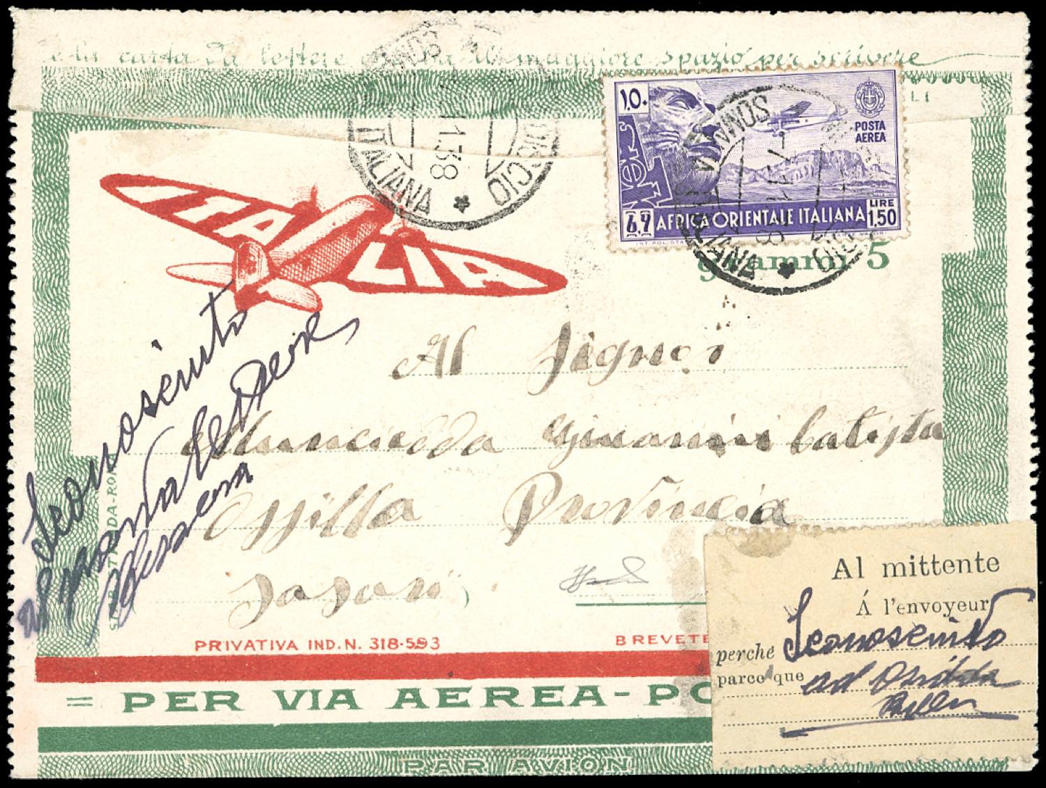 POSTA AEREA 1938 - 1,50 lire Soggetti vari (6), perfetto, su aerogramma da Mogadiscio 7/11/1938 ad Ossidda, rispedito al mittente perché ... Leggi tutto