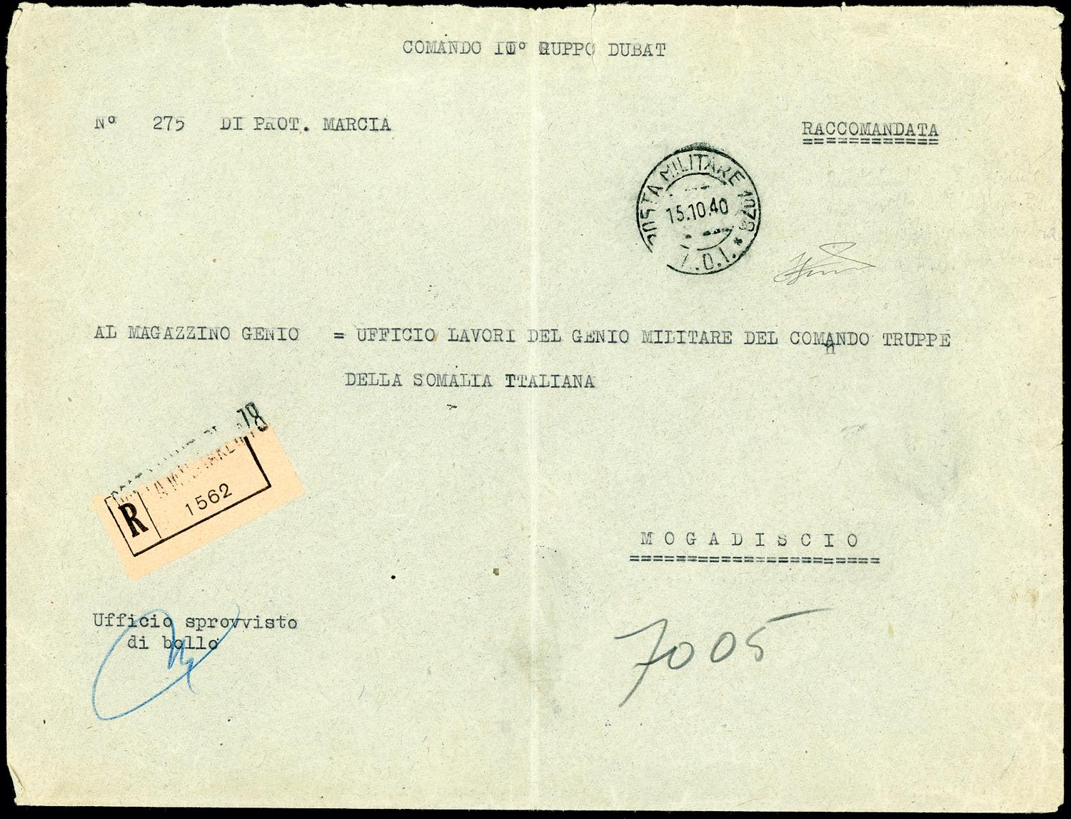 POSTA MILITARE 1940 - Busta raccomandata in franchigia spedita dall'ufficio della "Posta Militare n. 1078 15/10/1940" a Mogadiscio, al verso PM n. 1023 in transito e PM n. 56 in arrivo. Rarissima, Ferrario.
