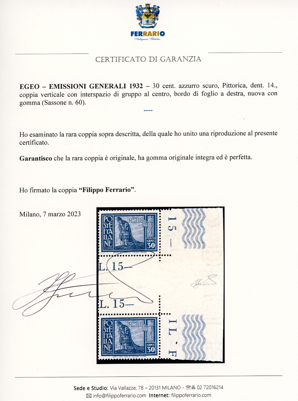 1932 - 30 cent. azzurro scuro Pittorica, dent. 14 (60), coppia verticale con interspazio di gruppo al centro, margine di foglio, nuova, gomma originale integra, perfetta. Splendida e rara! Cert. Ferrario.