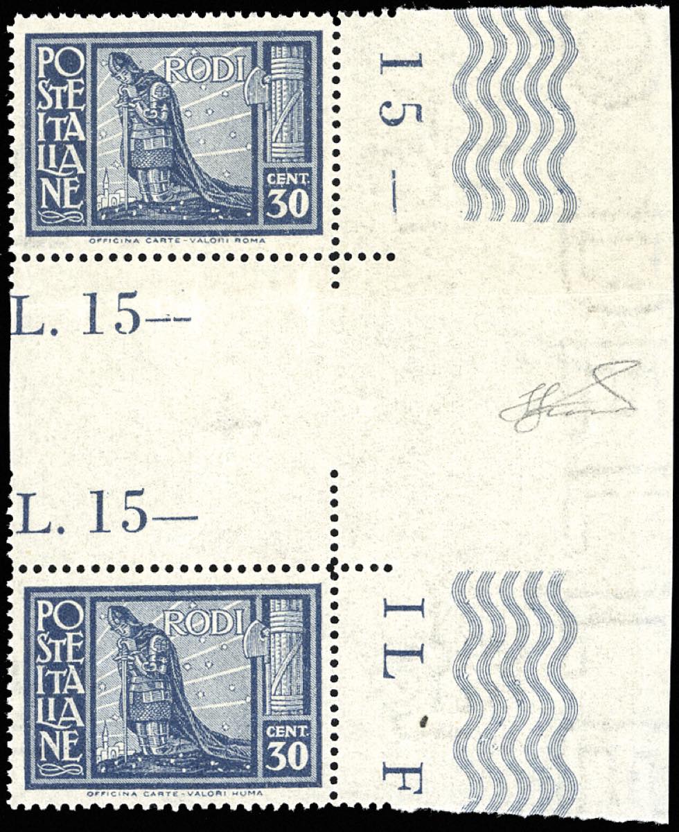 1932 - 30 cent. azzurro scuro Pittorica, dent. 14 (60), coppia verticale con interspazio di gruppo al centro, margine di foglio, nuova, ... Leggi tutto