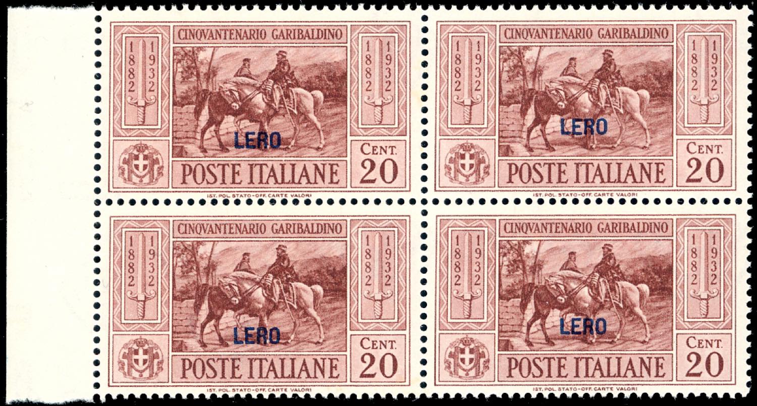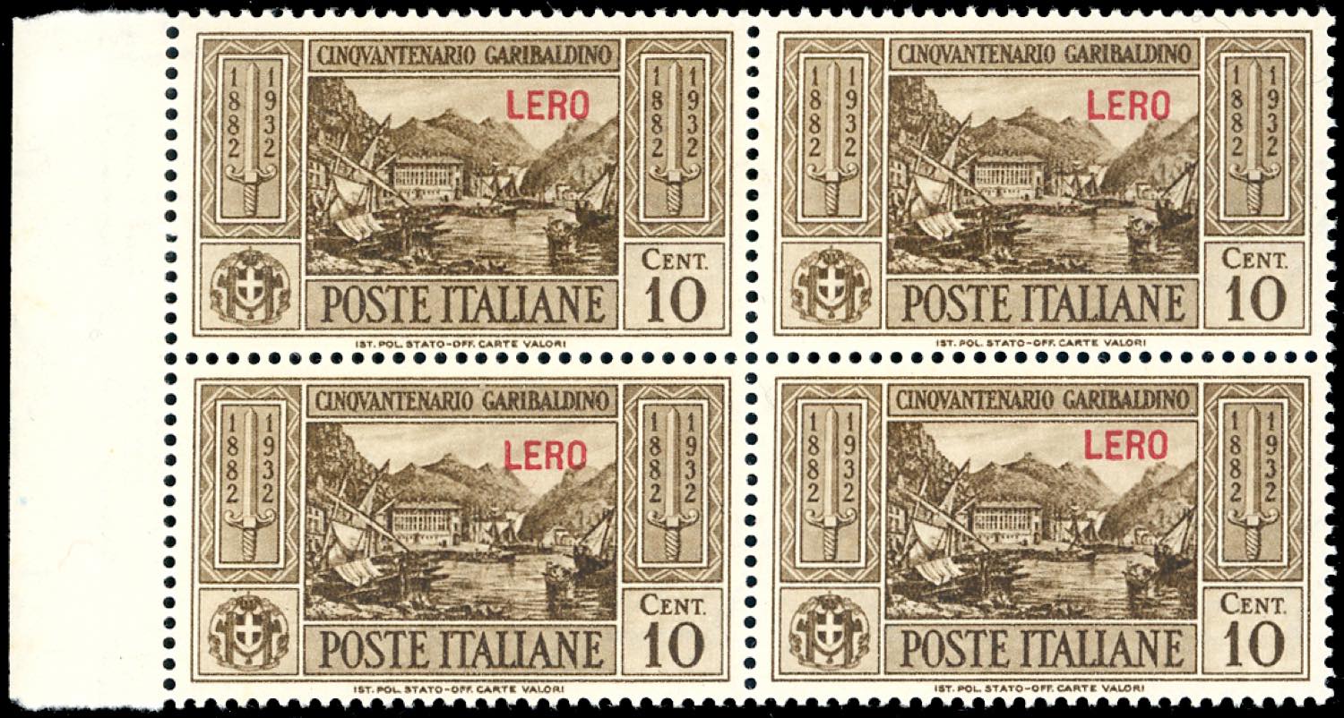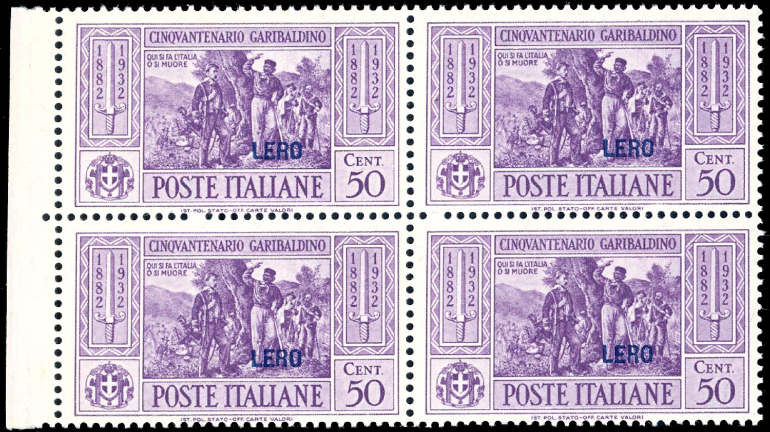 LERO 1932 - Garibaldi, serie completa (17/26), blocchi di quattro, quasi tutti bordo di foglio, gomma originale integra, perfetti, ottima qualità. Cert. Ferrario.