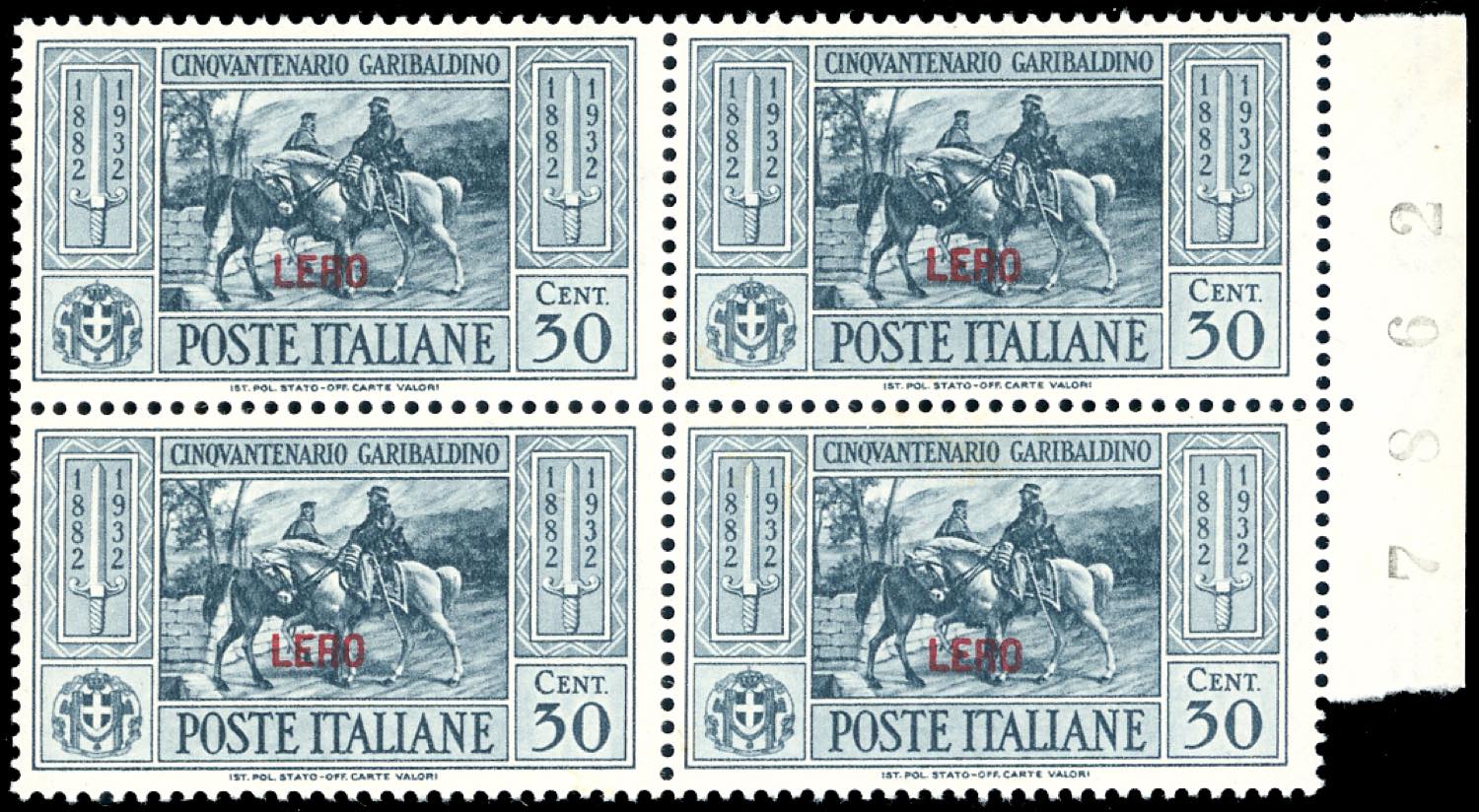 LERO 1932 - Garibaldi, serie completa (17/26), blocchi di quattro, quasi tutti bordo di foglio, gomma originale integra, perfetti, ottima ... Leggi tutto