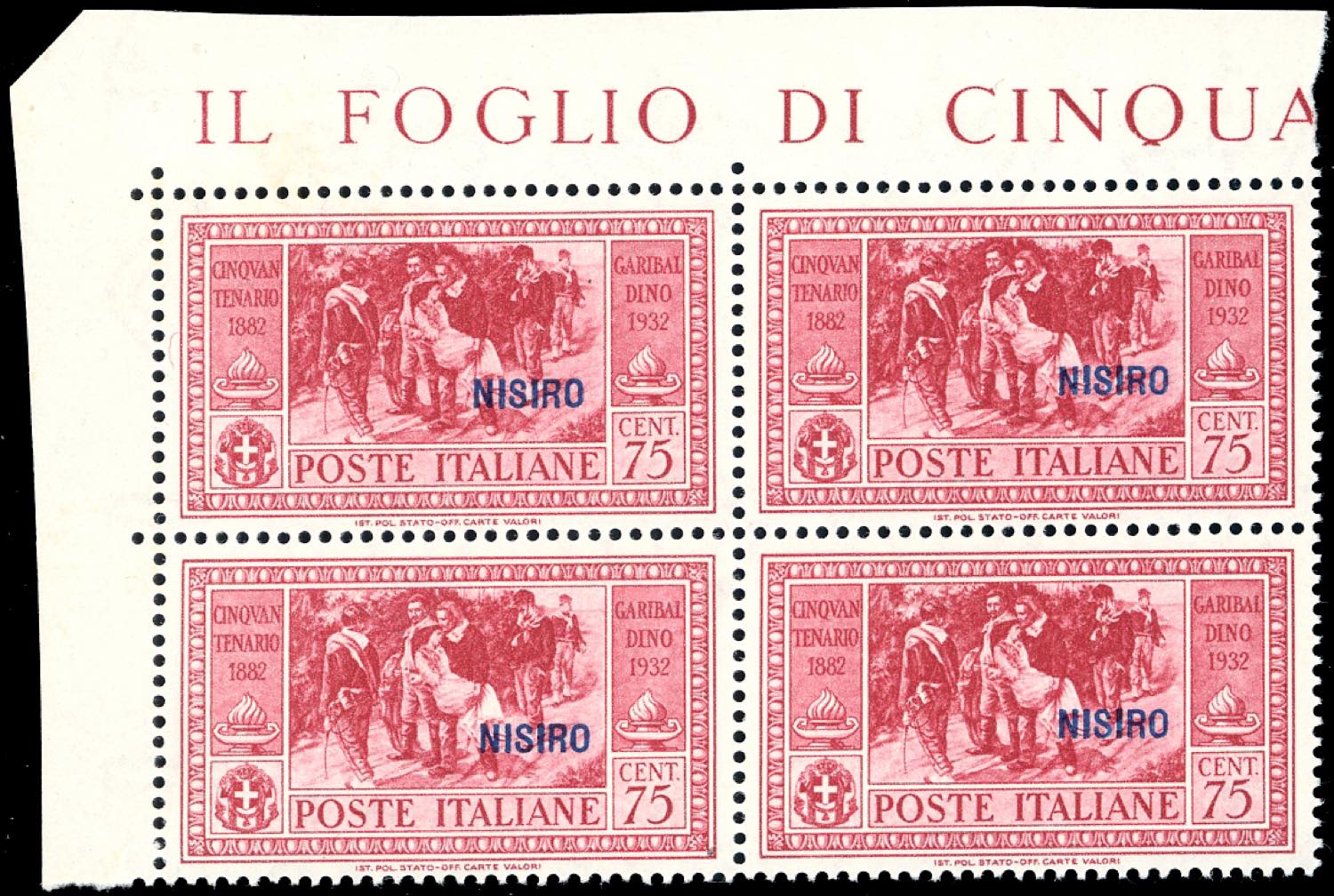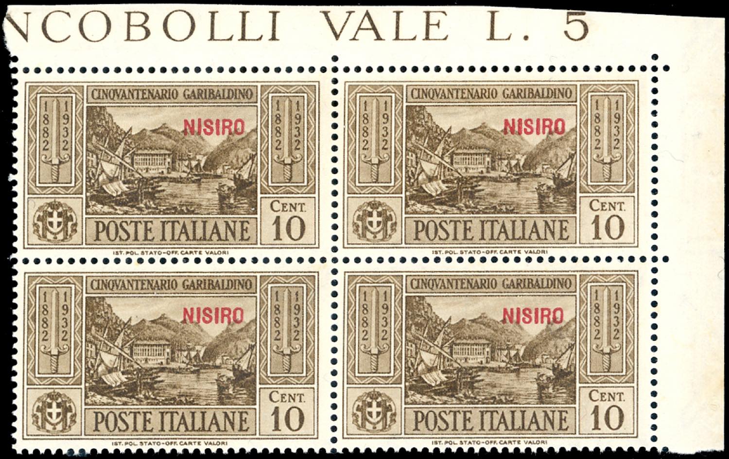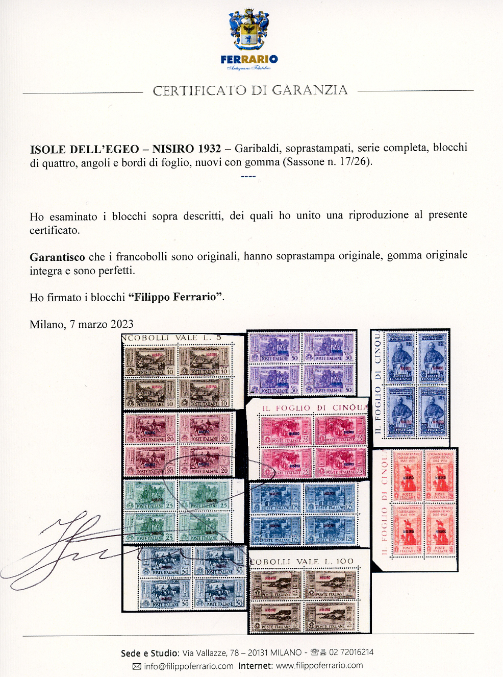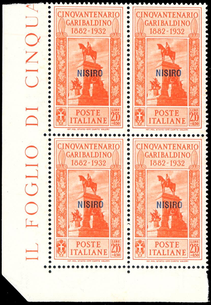NISIRO 1932 - Garibaldi, serie completa (17/26), blocchi di quattro, angolo/bordo di foglio, gomma originale integra, perfetti, ottima qualità. Cert. Ferrario.