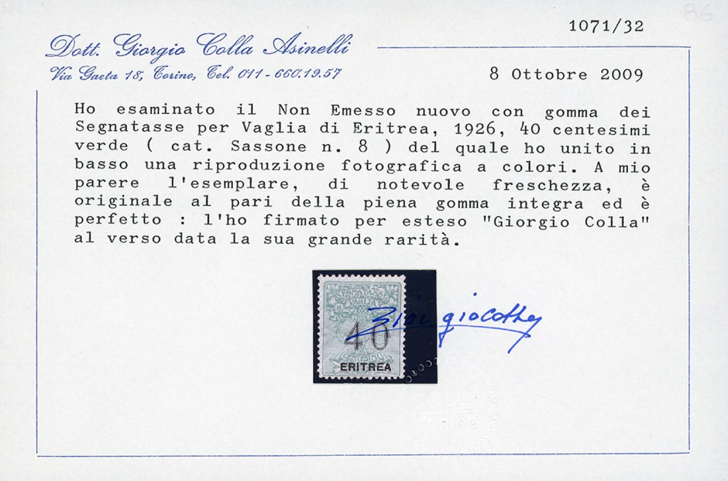 SEGNATASSE VAGLIA 1926 - 40 cent., soprastampa in caratteri più grandi, non emesso (8), gomma originale integra, perfetto. Molto bello e rarissimo. Pochissimi esemplari noti. E.Diena, cert. Colla.