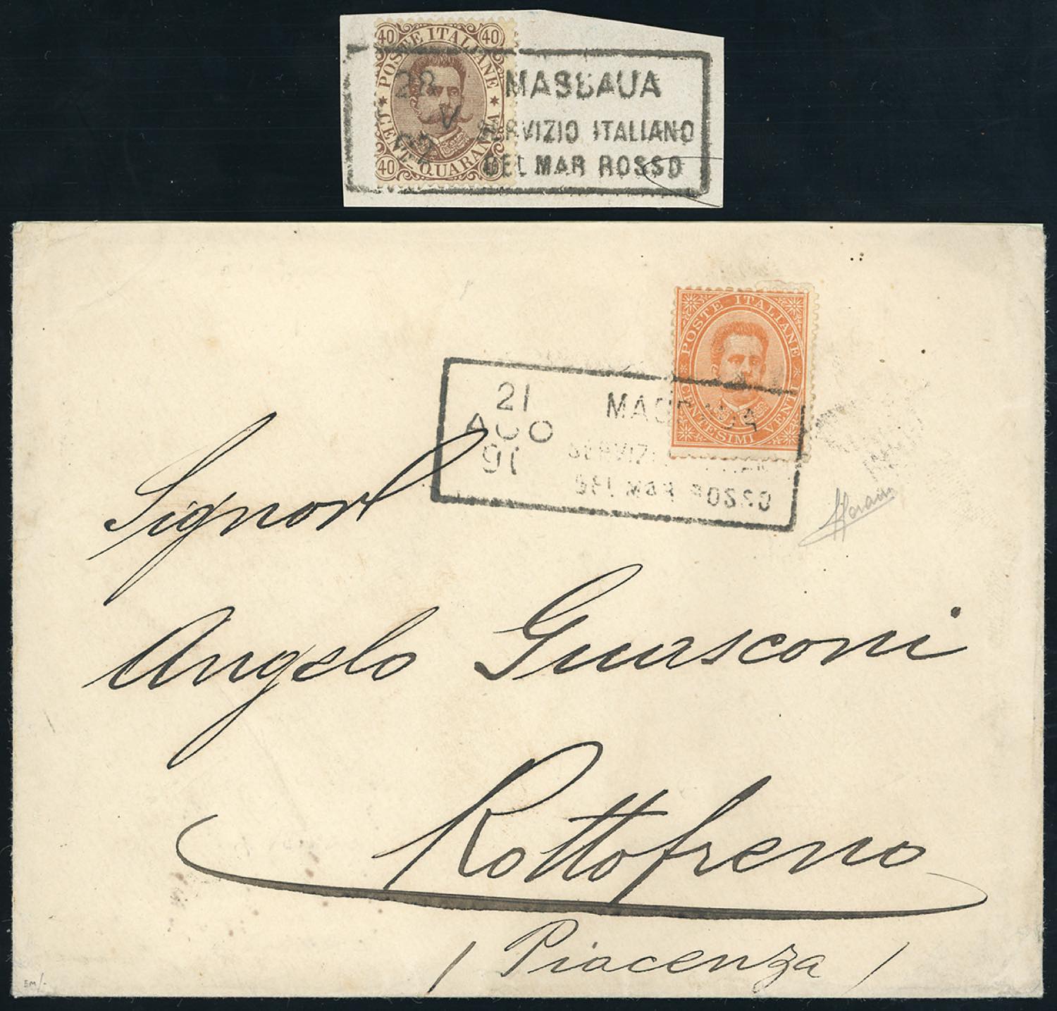 ANNULLAMENTI-MASSAUA SERVIZIO ITALIANO DEL MAR ROSSO - 20 cent. Umberto I (Regno 39), perfetto. Su busta del 21/8/1891 per Rottofreno. Unito un frammento con 40 cent. Umberto I (Regno 45), con lo stesso annullo del 28/11/1892. Raro insieme. Sorani per la busta.