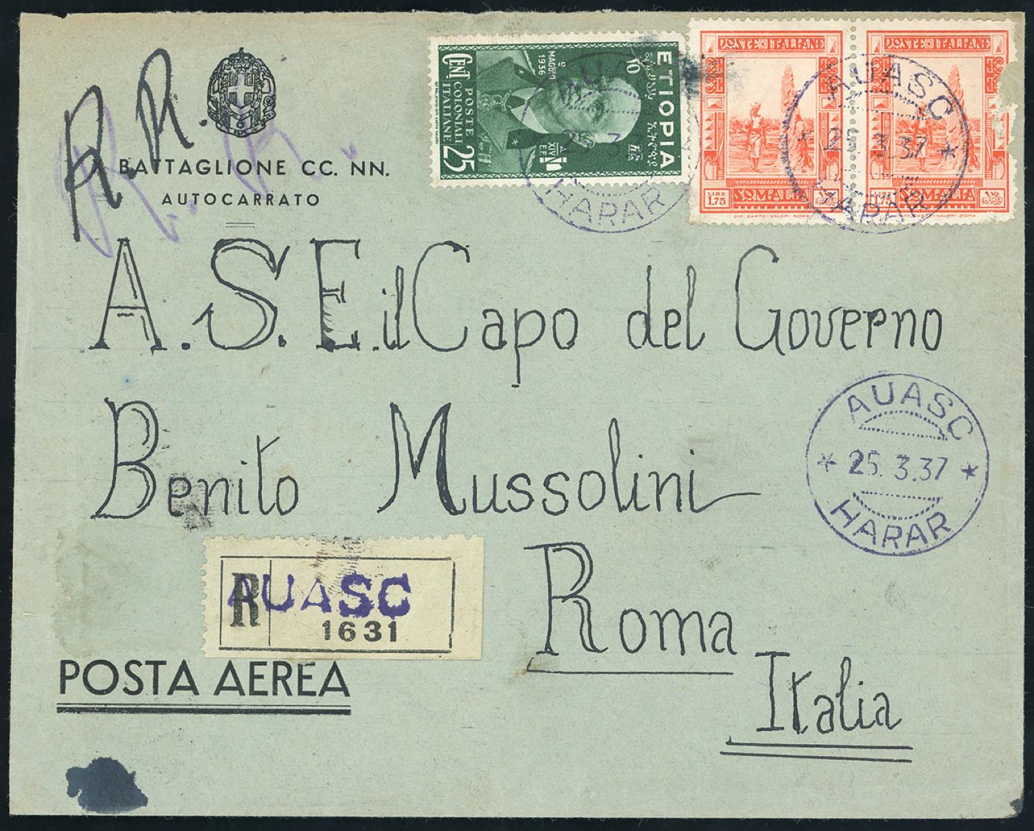 HARAR ANNULLAMENTI-AUASC - 25 cent. Vittorio Emanuele III (3), 1,75 lire Pittorica di Somalia, coppia (224), difettosi, su busta raccomandata del 25/3/1937, annullo in viola, per Roma, indirizzata a Benito Mussolini.