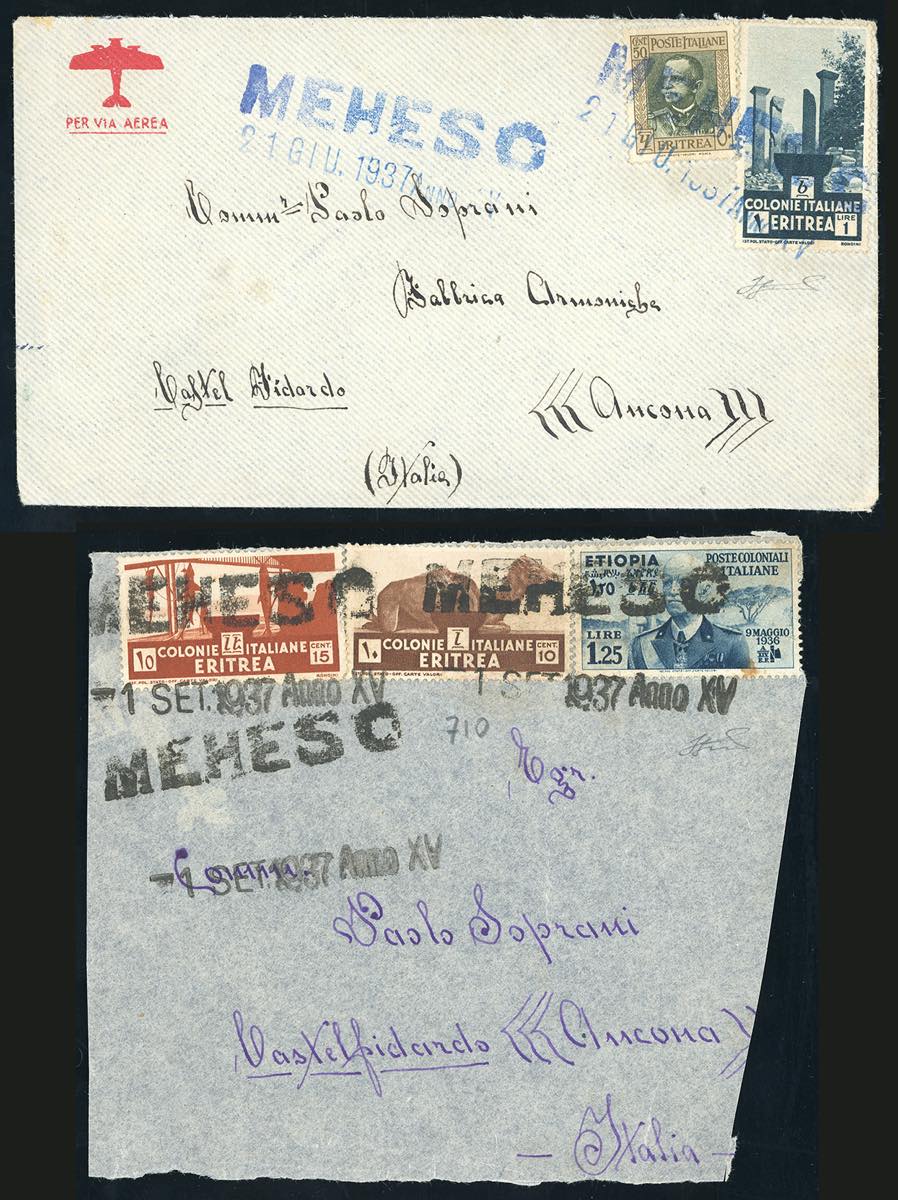 HARAR ANNULLAMENTI-MEHESO - Un aerogramma e un frontespizio di busta per Castelfidardo, la prima del 21/6/1937 con il lineare in azzurro, il secondo del 1/9/1937 con il lineare in nero. Raro insieme. Ferrario.