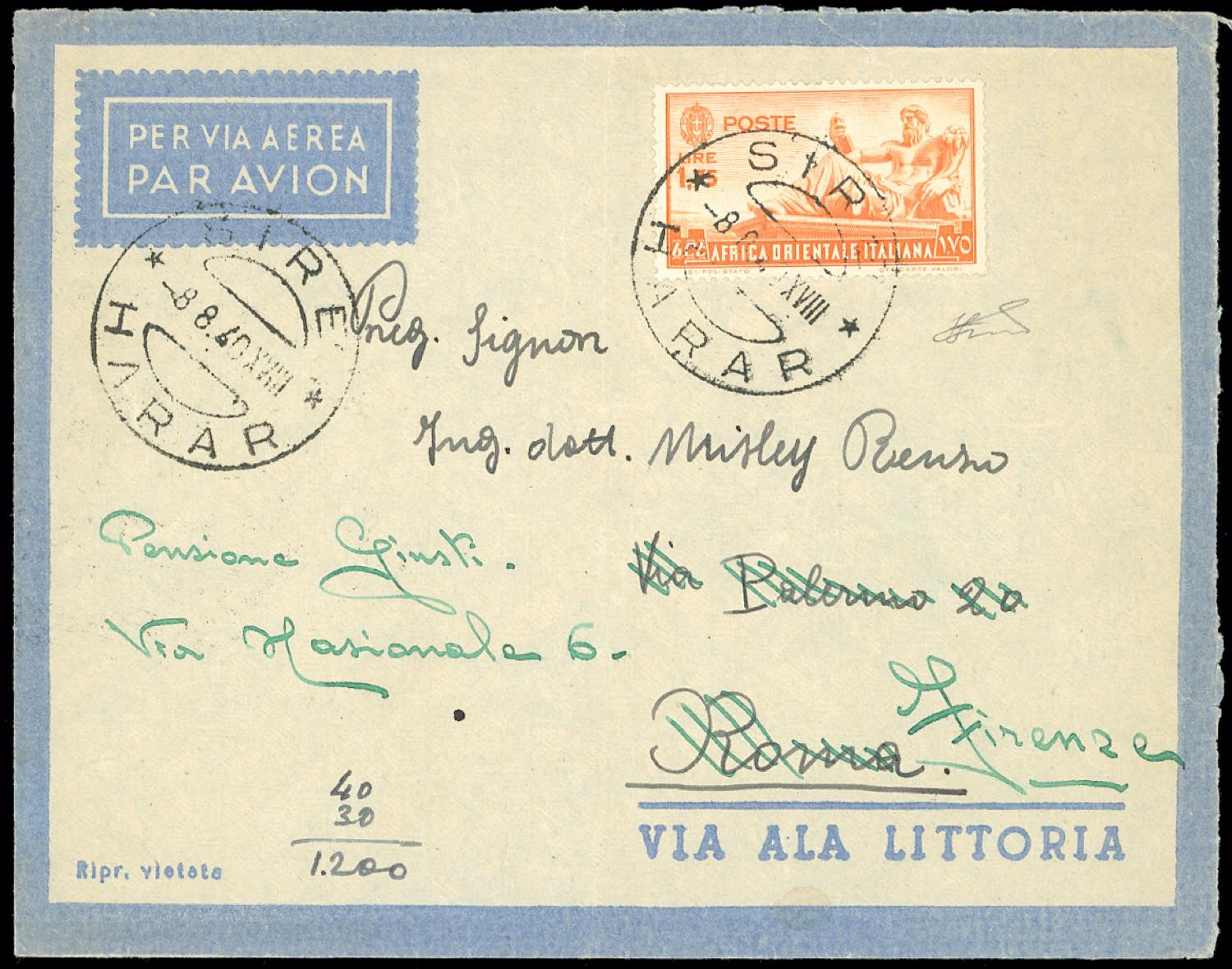 HARAR ANNULLAMENTI-SIRE' - 1,75 lire AOI (14), perfetto, su aerogramma del 8/8/1940, datario grande, a Roma, rispedita a Firenze. Raro annullo. Ferrario.