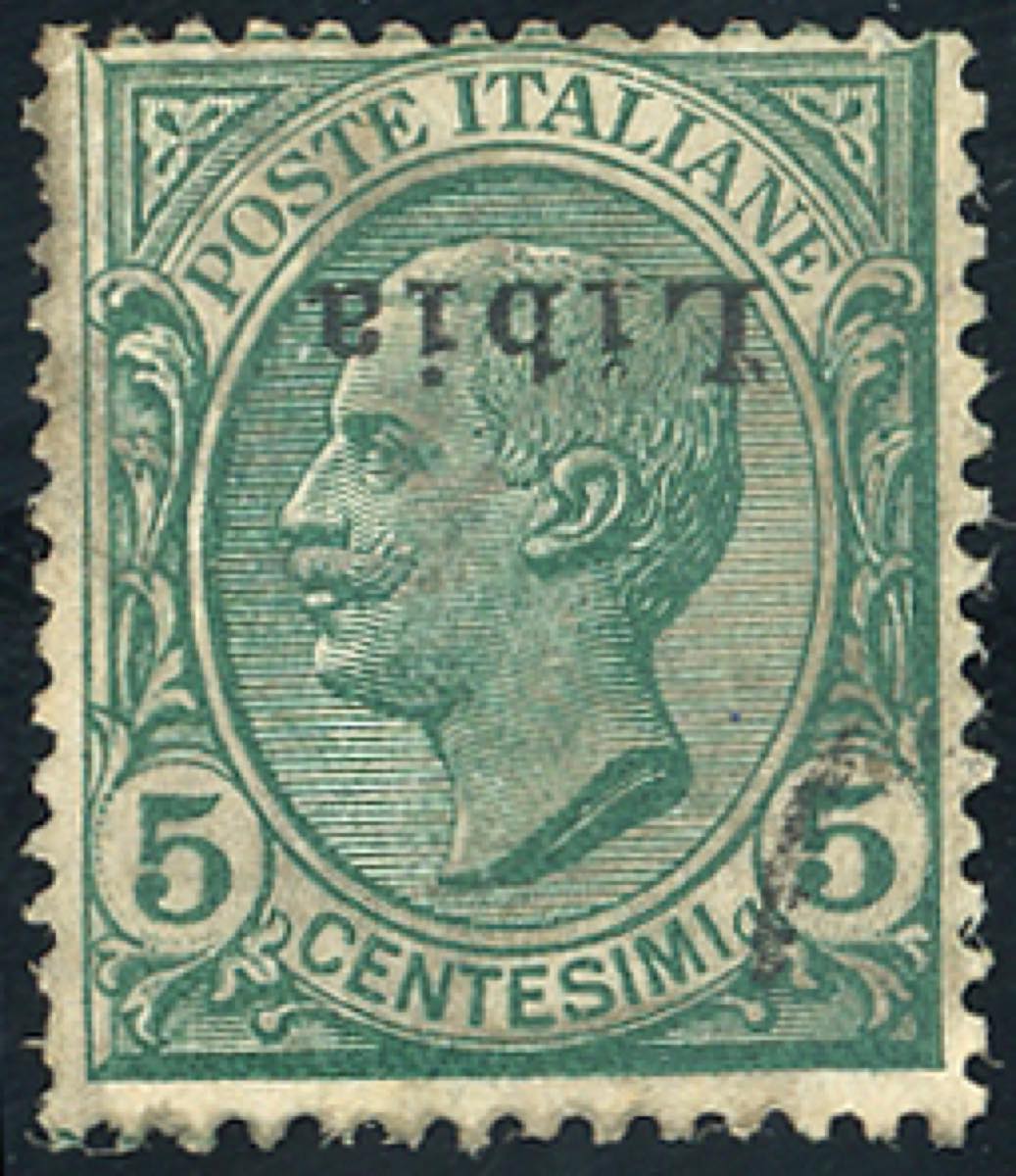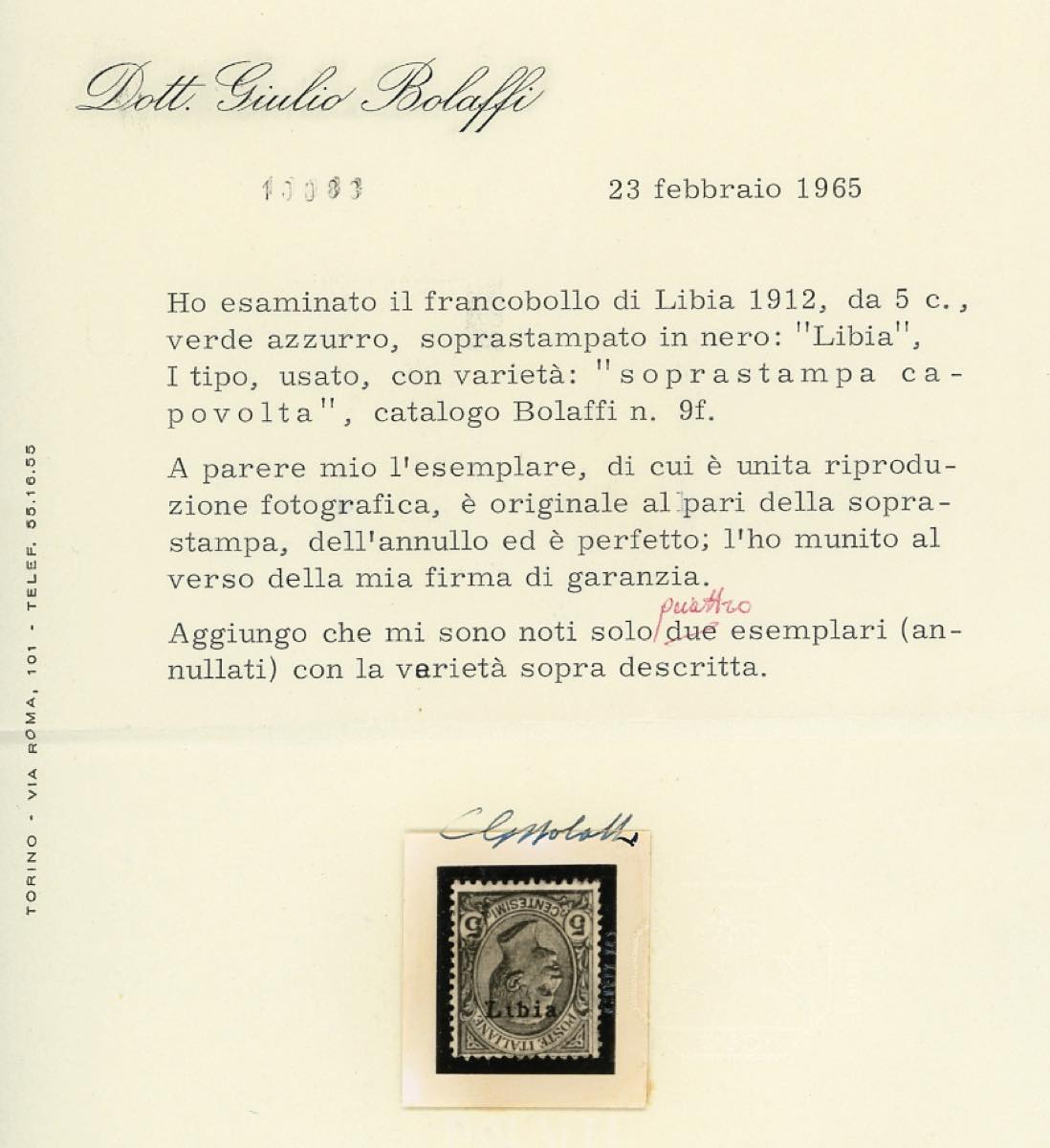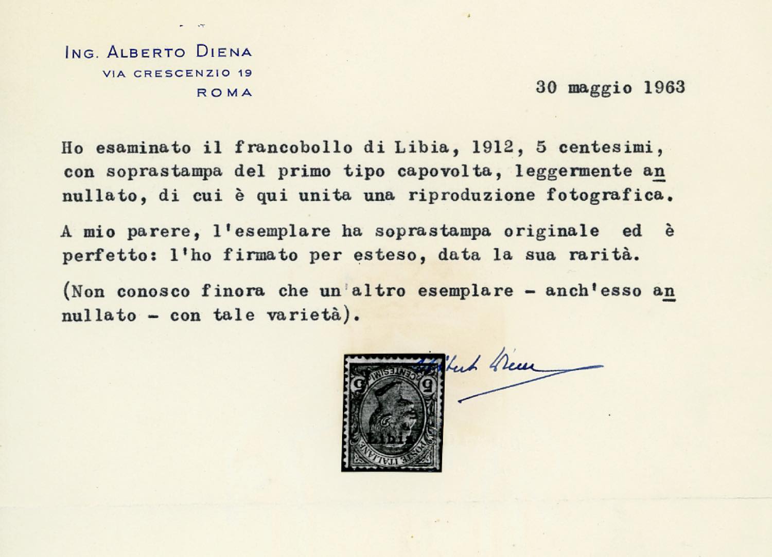 1912 - 5 cent. Leoni, soprastampa capovolta (3c), perfetto, usato. Rarissimo, TRE SOLI ESEMPLARI NOTI. Cert. G.Bolaffi, A.Diena, Ferrario.