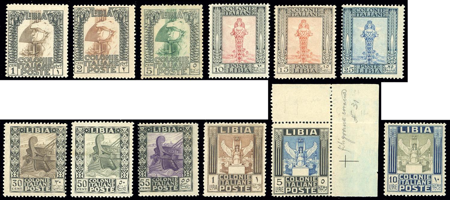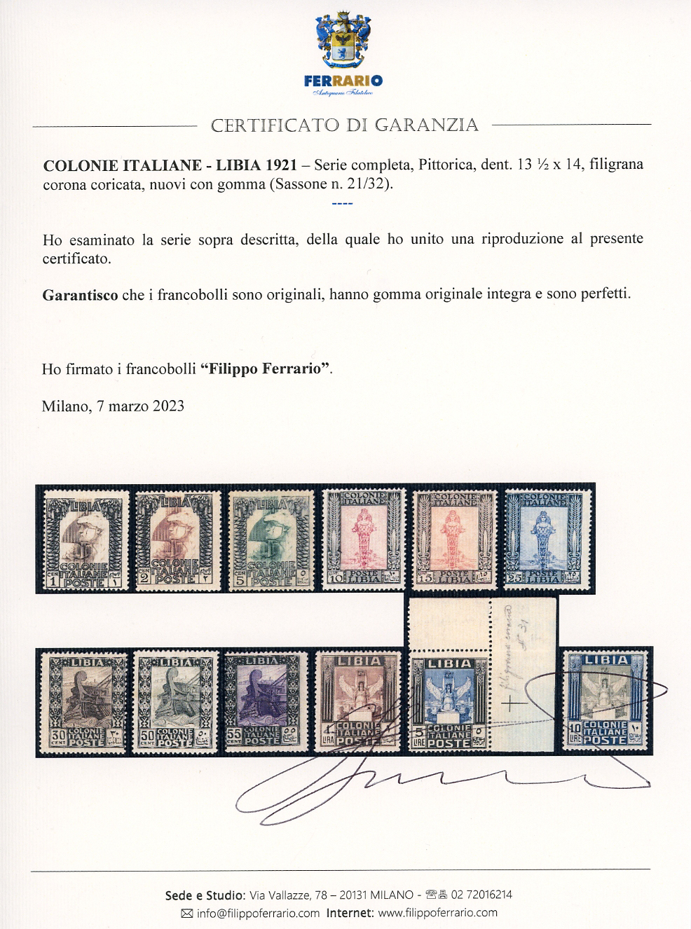 1921 - Pittorica, filigrana corona, serie completa (21/32), gomma originale integra, perfetti, ottima qualità. Cert. Ferrario.