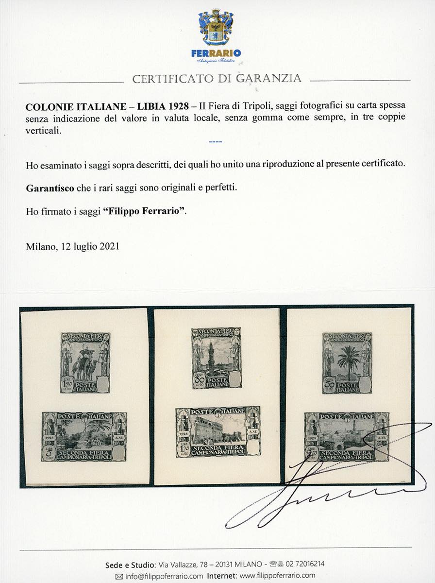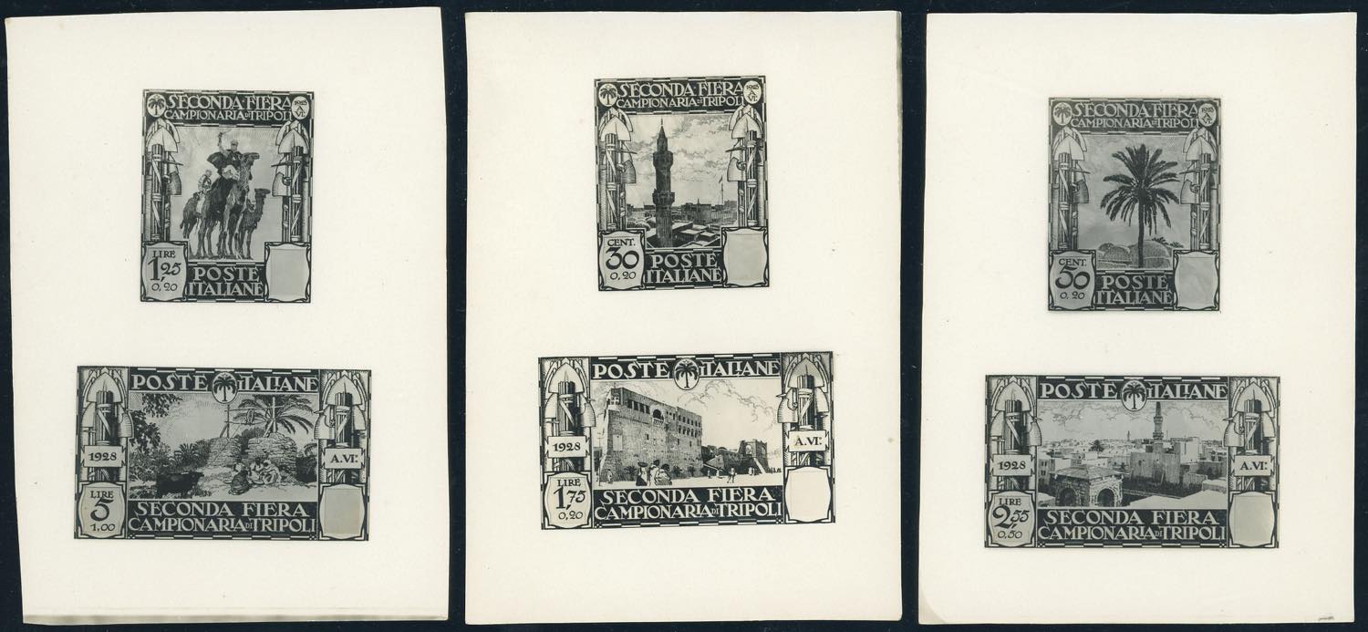 1928 - II Fiera di Tripoli (72/77), saggi fotografici senza indicazione del valore in valuta locale, senza gomma come sempre, perfetti. Rari. Cert. Ferrario.
