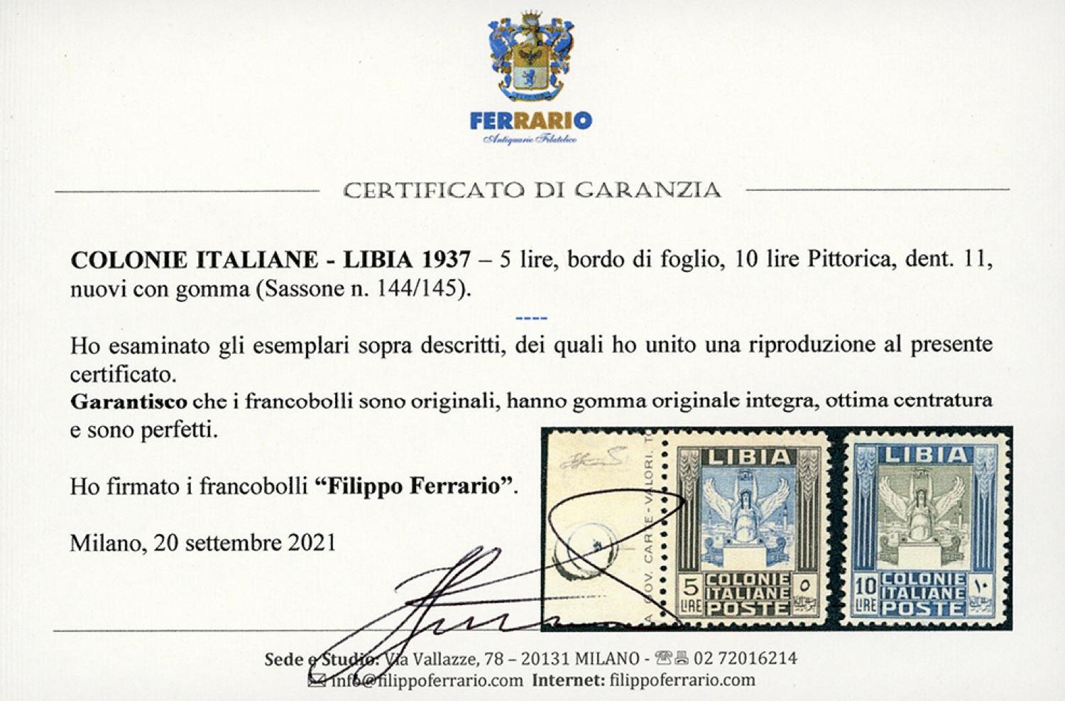 1937 - 5 lire e 10 lire Pittorica, dent. 11 (144/145), ottima centratura, bordo di foglio per il 5 lire, gomma originale integra, perfetti. Splendidi e rari in queste condizioni. Cert. Ferchenbauer e Ferrario.