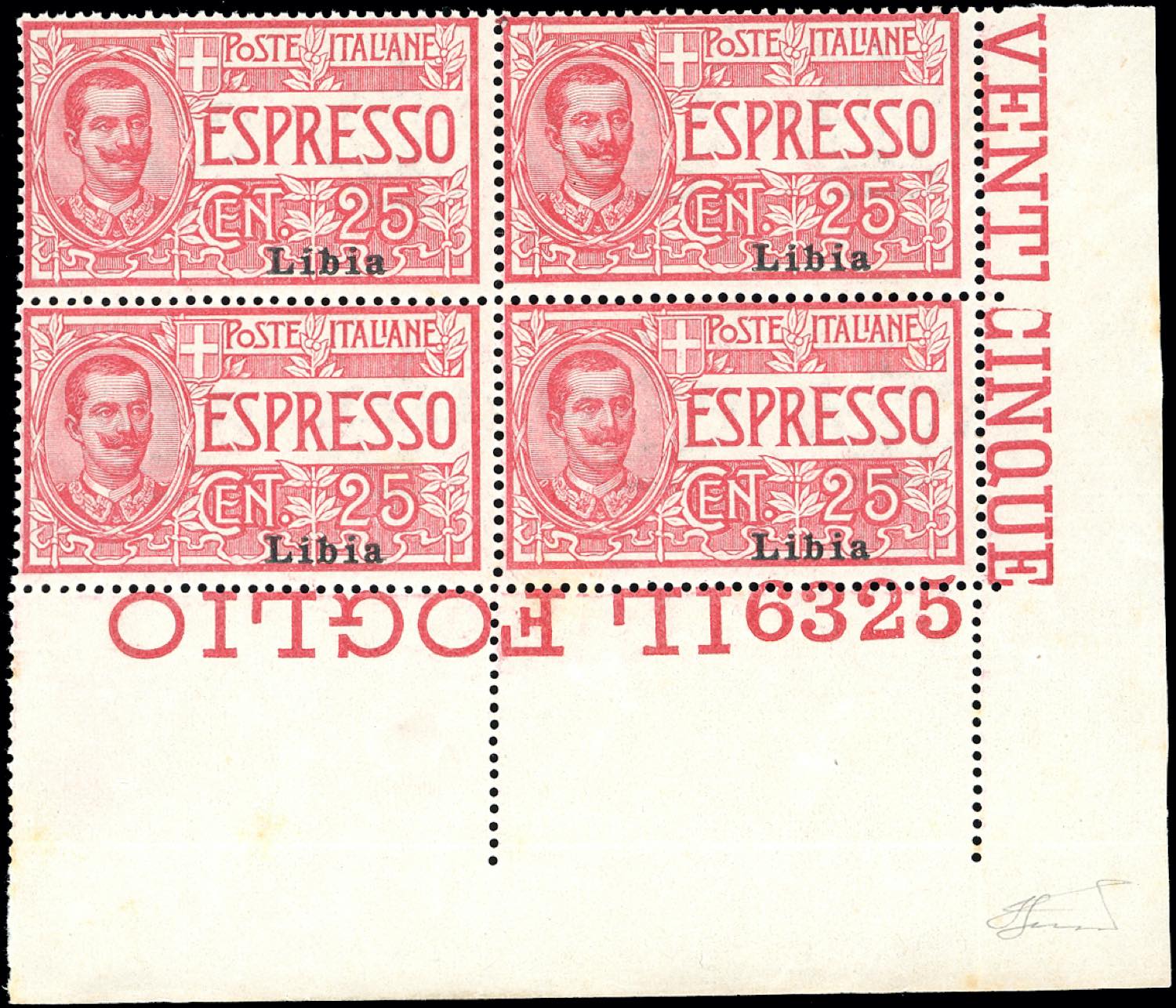 ESPRESSI 1915 - 25 cent. rosa, soprastampa del I tipo, blocco di quattro angolo di foglio inferiore destro con numero di tavola 6325 (1), ... Leggi tutto