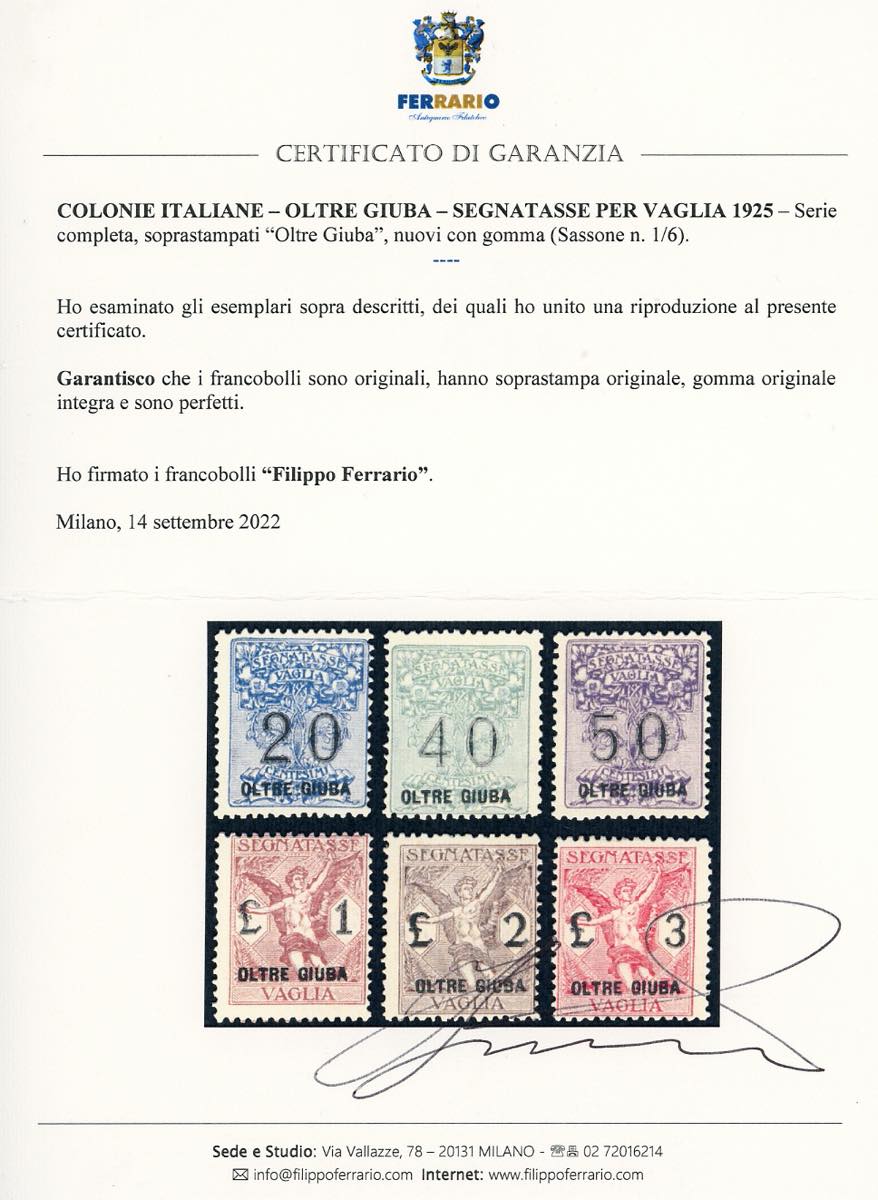 SEGNATASSE VAGLIA 1925 - Serie completa (1/6), gomma originale integra, perfetti. Cert. Ferrario.