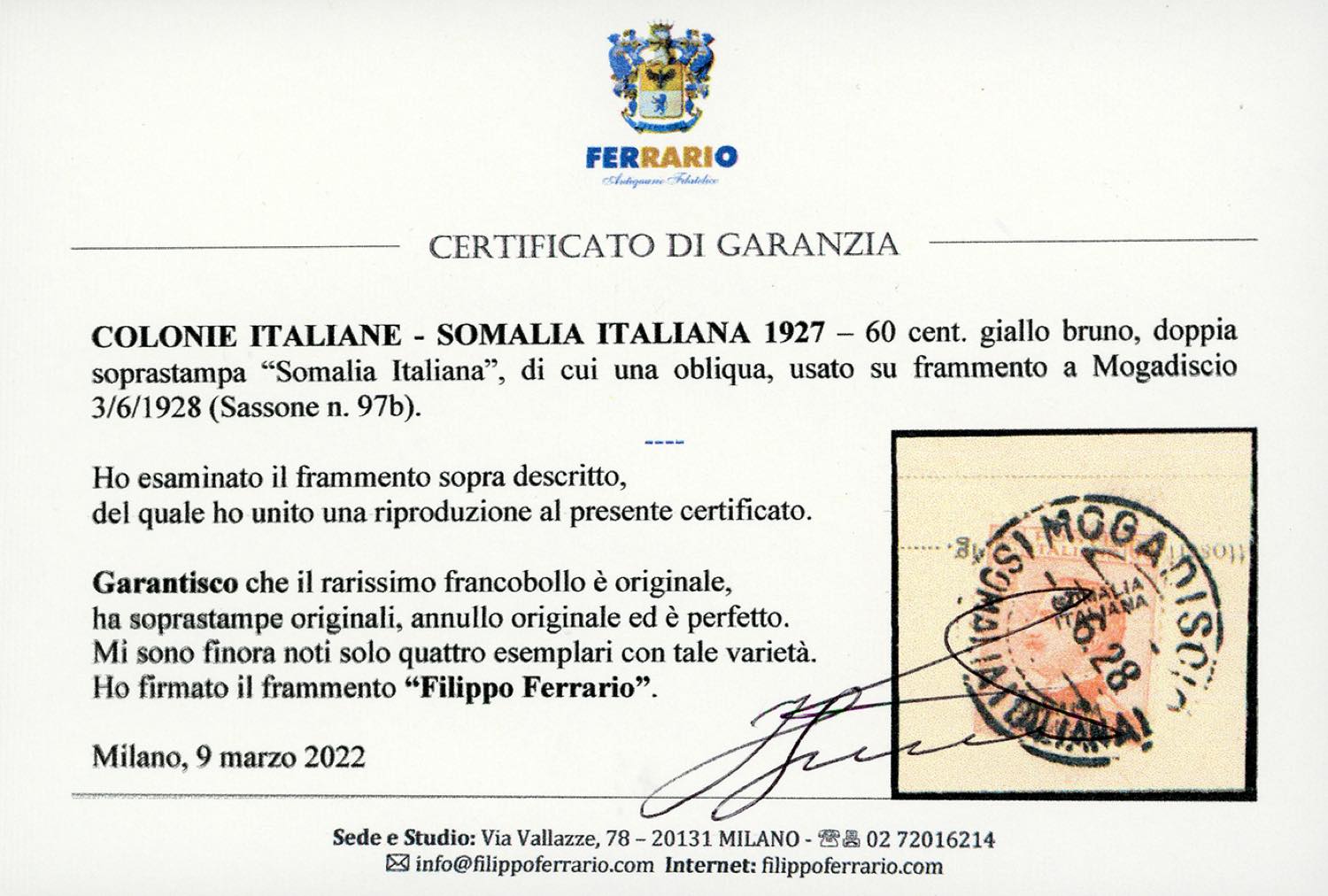 1927 - 60 cent. Michetti, doppia soprastampa di cui una obliqua (97b), perfetto, usato su frammento a Mogadiscio 3/6/1928. Molto raro, SOLO QUATTRO ESEMPLARI NOTI. E.Diena, cert. Ferrario.