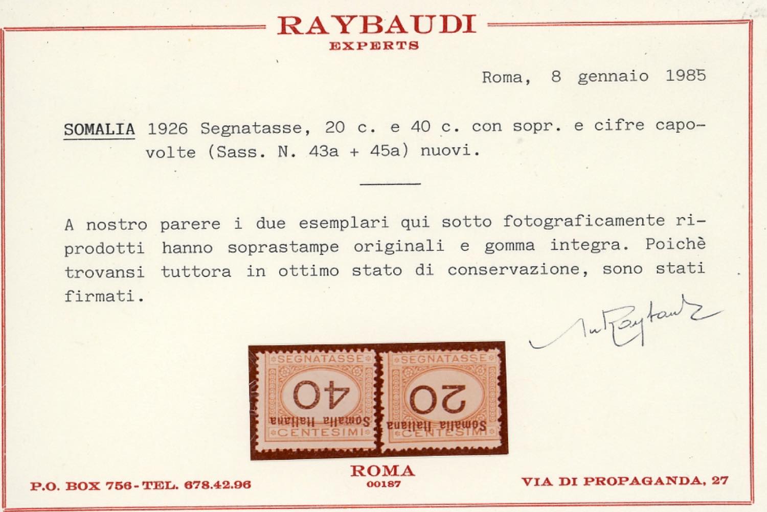 SEGNATASSE 1926 - Cifre nere, moneta italiana, cinque valori con soprastampa capovolta (42a/46a), gomma originale integra per i n. 43a e 45a, perfetti. Cert. Raybaudi per i n. 43a e 45a.