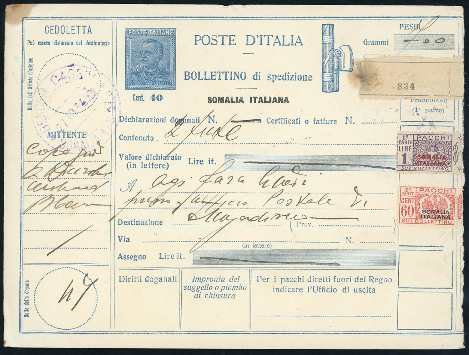 ANNULLAMENTI-BENDER CASSIM - 60 cent., soprastampata nera, 1 lira, soprastampa rossa pacchi postali (35,59), entrambi sezione sinistra, ad integrazione di bollettino pacchi da 40 cent. (Filagrano P18), del 27/10/1934, datario grande in viola, per Mogadiscio.