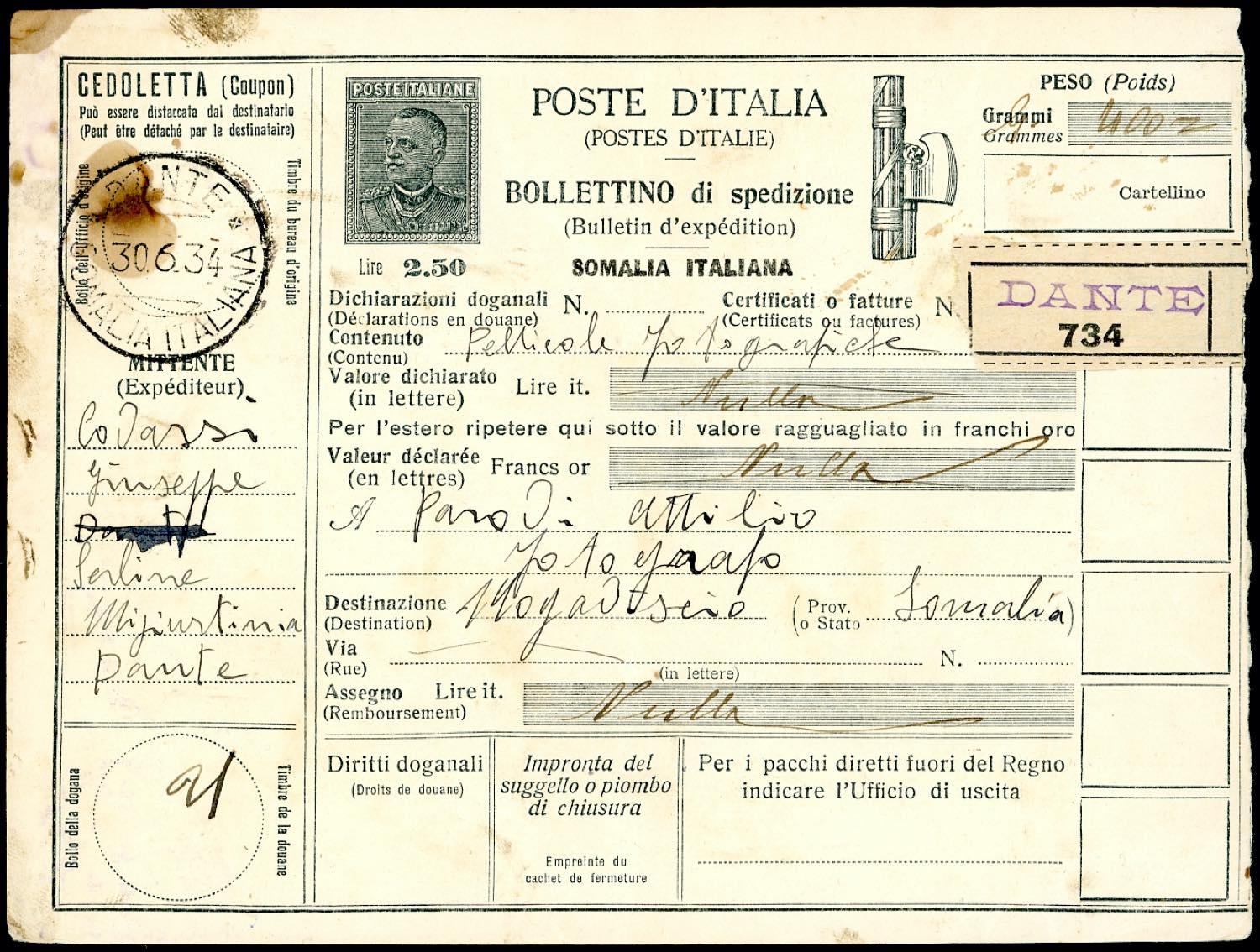 ANNULLAMENTI-DANTE - 2,50 lire bollettino pacchi (Filagrano P19), del 30/6/1934 per Mogadiscio. Non comune.
