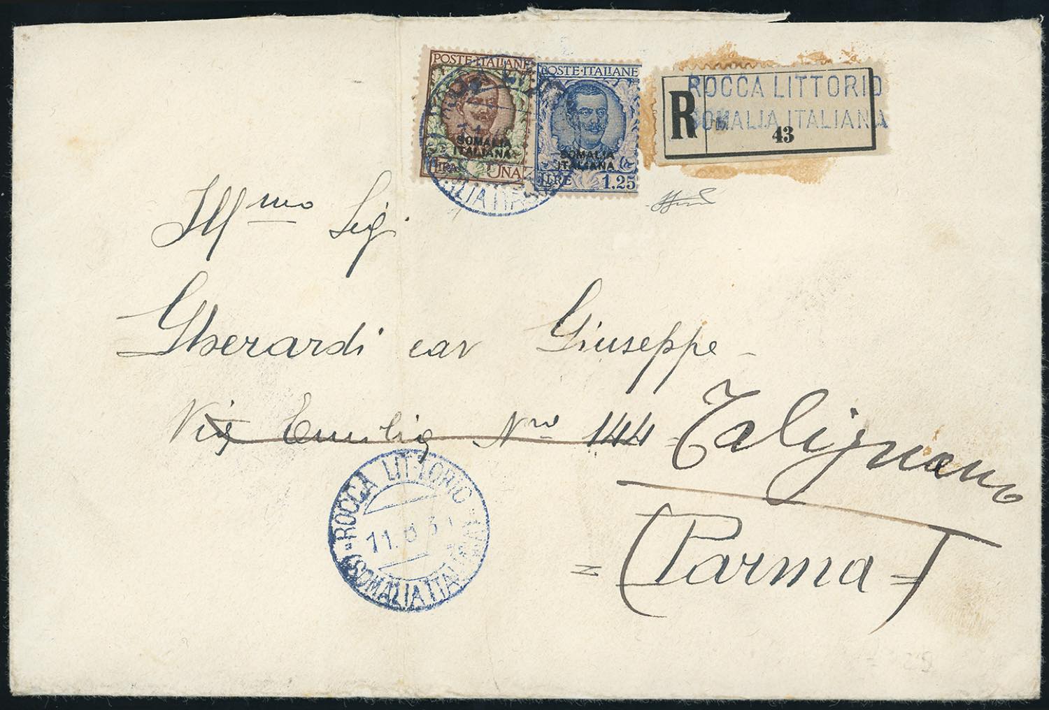 ANNULLAMENTI-GALLACAIO poi ROCCA LITTORIO, violetto punti 10 - 1 lira e 1,25 lire Floreale soprastampati (99,1009, perfetti, su busta raccomandata del 11/6/1930 per Parma, bolli di transito e arrivo. Non comune. (cat.Sassone € 650 per la sola affrancatura). Ferrario.