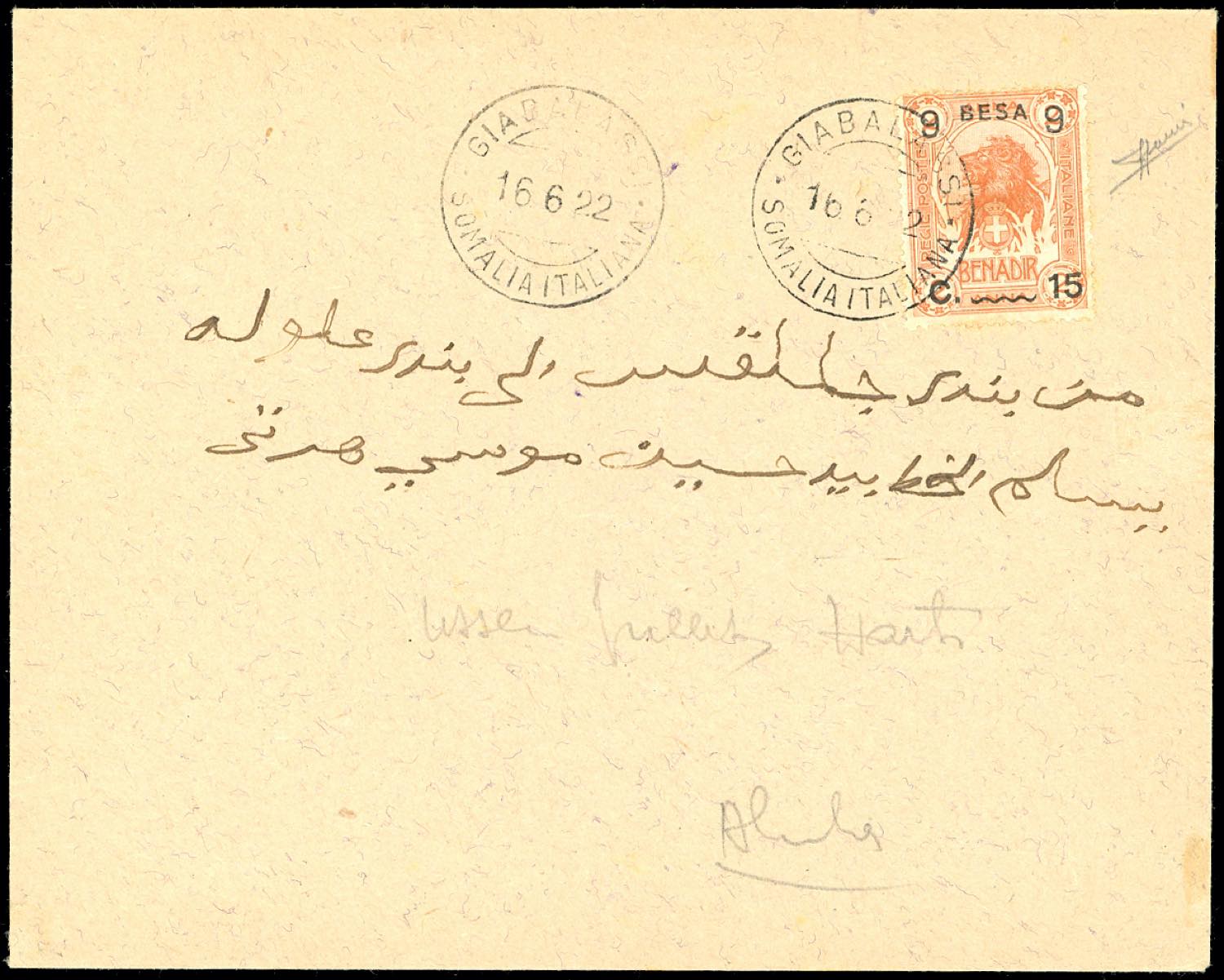 ANNULLAMENTI-GIABALASSI - 9 b. su 15 cent. su 2 a. (26), perfetto, su busta del 16/6/1922 per Alula, bollo di arrivo al verso. Rara.