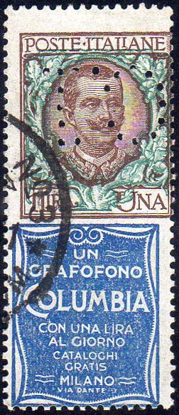 1924 - 1 lira Columbia, vignetta fortemente spostata (19), perforato "CI" (Credito Italiano) specularmente, usato, perfetto. Varietà non catalogata.