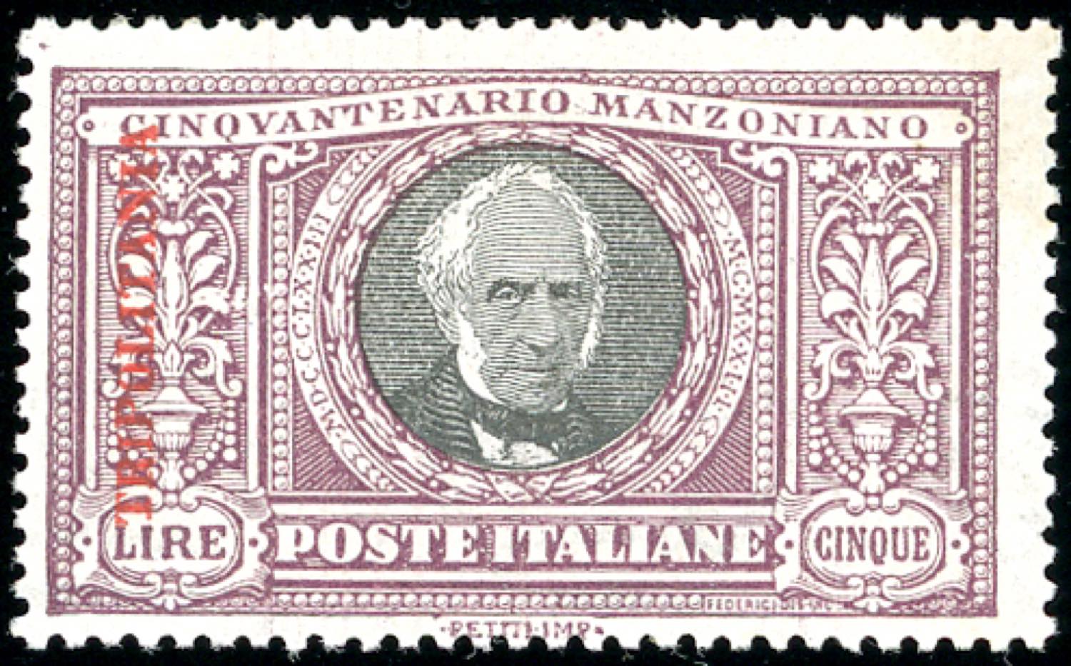 1924 - 5 lire Manzoni, pos. 14 con ritocco (16a), gomma integra, perfetto. Molto raro, tiratura solo 75 esemplari. Cert. Avi.