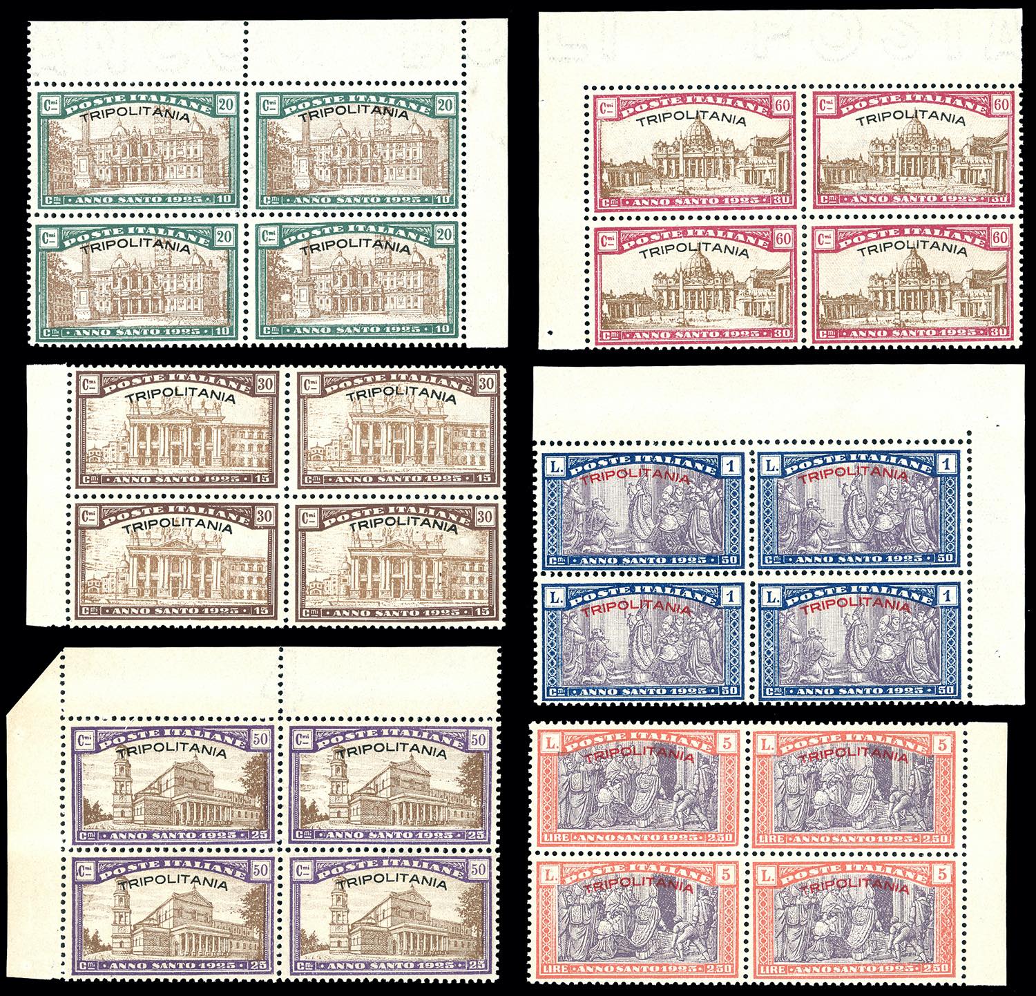 1925 - Anno Santo, serie completa (17/22), blocchi di quattro, angolo/bordo di foglio, gomma originale integra, perfetti. Belli.