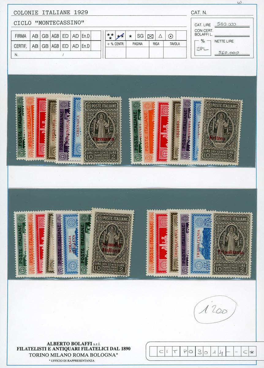 1929 - Montecassino, serie completa, giro delle 4 Colonie (Cirenaica 53/59,Eritrea 145/151,Somalia 123/129,Tripolitania 54/60), gomma originale integra, perfetti. Eccellente qualità.