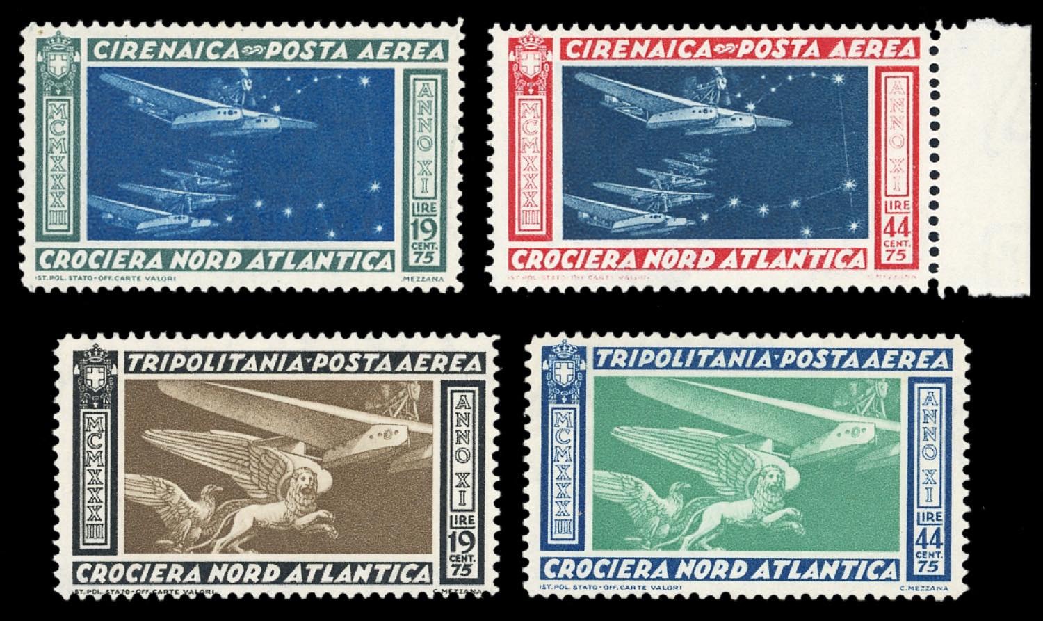 POSTA AEREA 1933 - Crociera Balbo, giro completo delle due colonie (Cirenaica 18/19,Tripolitania 20/29), gomma originale integra, perfetti e di ottima qualità. G.Bolaffi per tre esemplari.