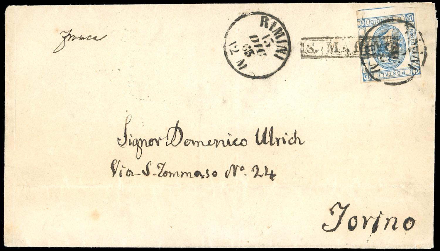 1863 - 15 cent. azzurro Litografico, I tipo, su lettera da San Marino 13/12/1863, bollo in cartella e datario di Rimini coannullatori, a Torino. L'uso di questo francobollo nel dicembre 1863 è molto raro in Italia, questa è l'unica lettera nota con il 15 cent. Litografico I tipo usato a San Marino nel dicembre 1863. Per specialista.