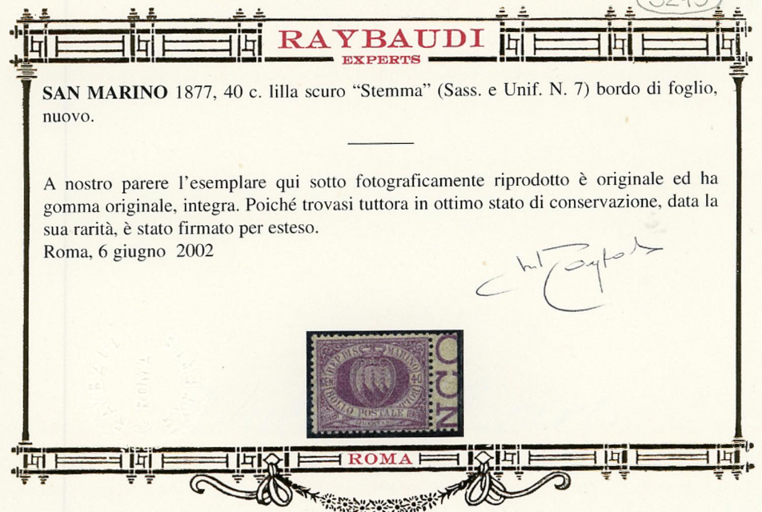 1877 - 40 cent. Stemma (7), buona/ottima centratura, bordo di foglio, gomma originale integra, perfetto. Splendido e molto fresco. G.Bolaffi, cert. Oro Raybaudi (cat.Sassone € 3.600/11.400).