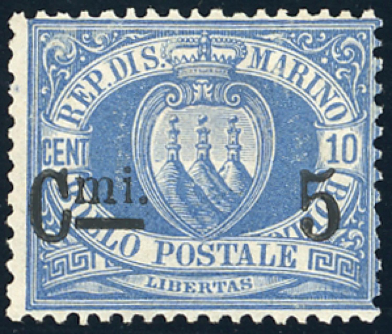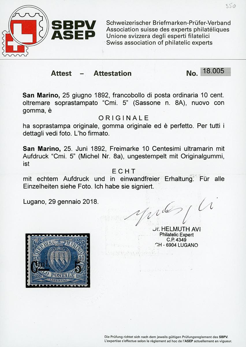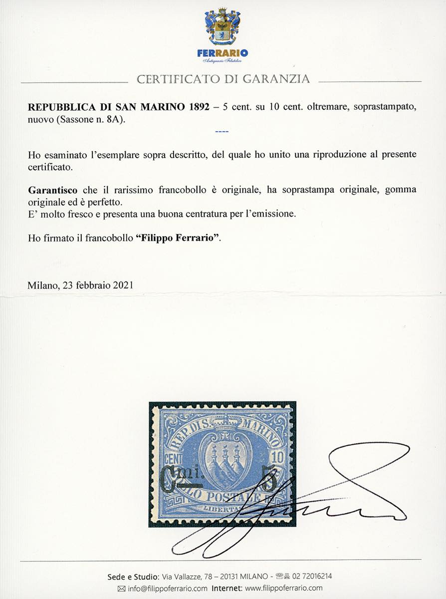 1892 - 5 cent. su 10 cent. oltremare, soprastampato (8A), nuovo, gomma originale, lieve traccia di linguella, perfetto. Molto fresco e buona centratura per questo francobollo, di cui si conoscono solo pochissimi esemplari allo stato di nuovo. Grande rarità. Cert. Avi, Cilio, Colla e Ferrario.