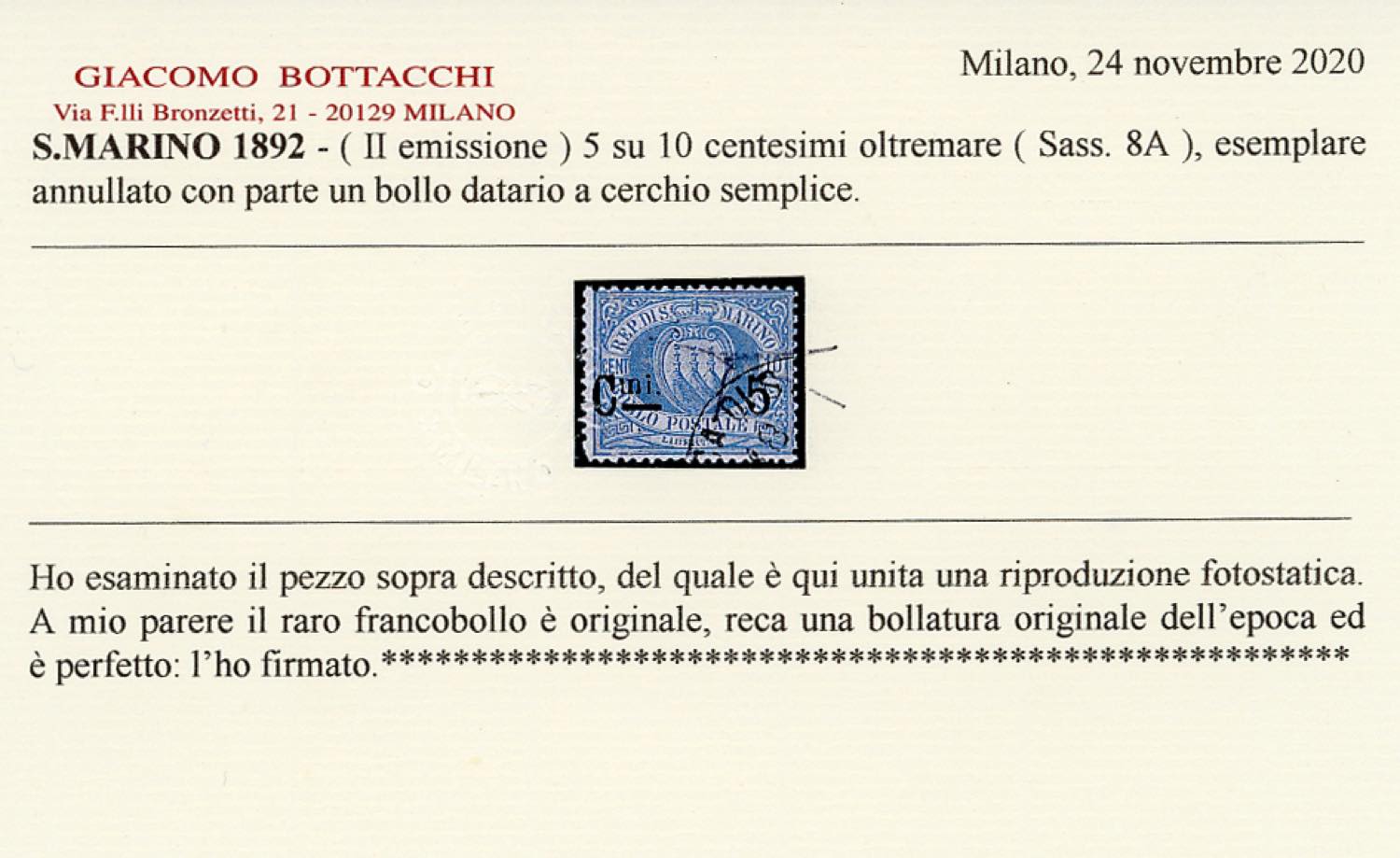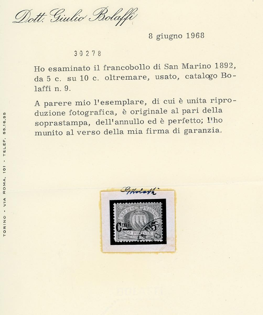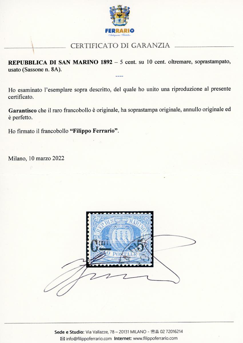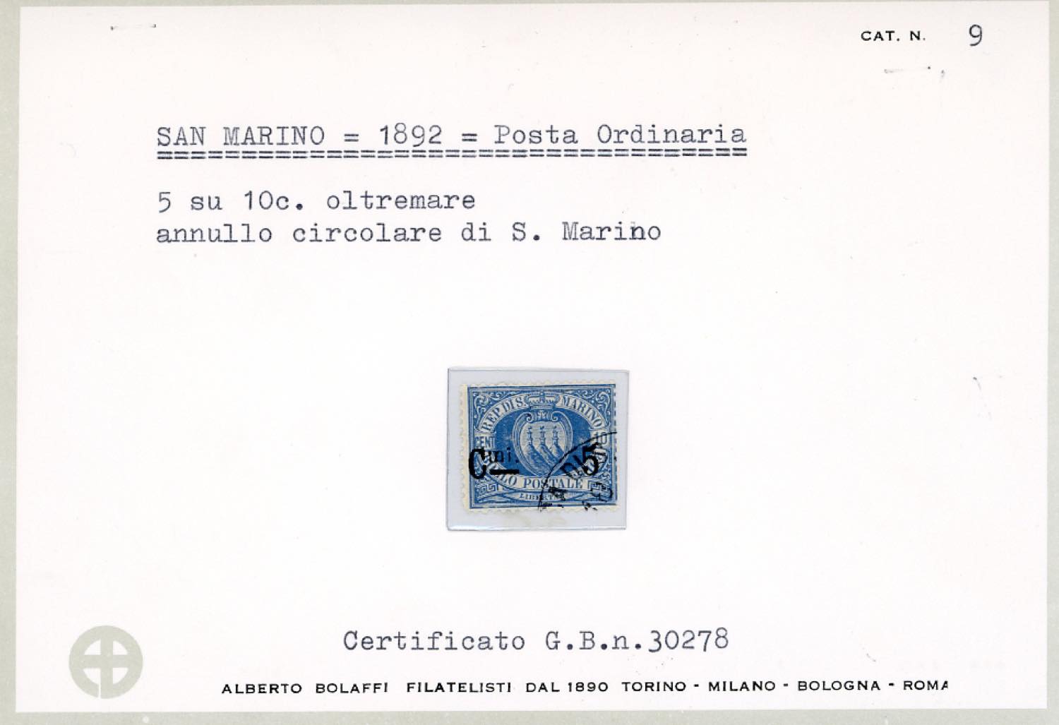 1892 - 5 cent. su 10 cent. oltremare (8A), usato, perfetto. Raro e di ottima qualità. Cert. G.Bolaffi, Bottacchi, Ferrario.