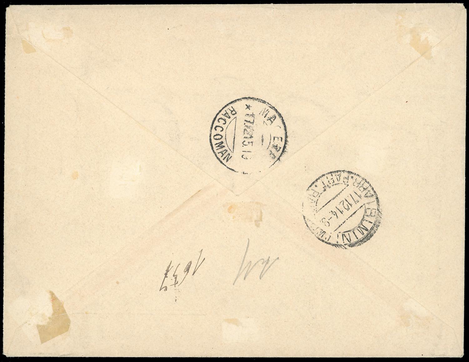 1914 - 1 e 2 lire Vedute, 1 cent. Stemma fondo giallo e 25 cent. espresso (43,44,49,E1), perfetti, su busta raccomandata del 16/12/1914 per Macerata. Non comune! Ferrario.