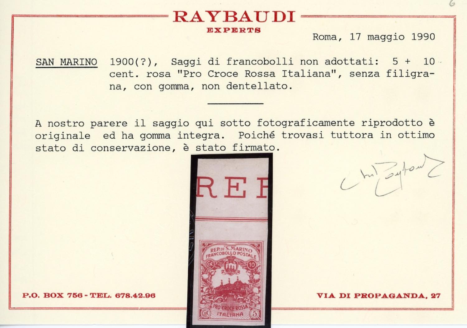 1916 - 10 + 5 cent. Croce Rossa, non dentellato (CEI 50Aa, € 1.500), bordo di foglio, gomma integra, perfetto. Cert. Raybaudi.