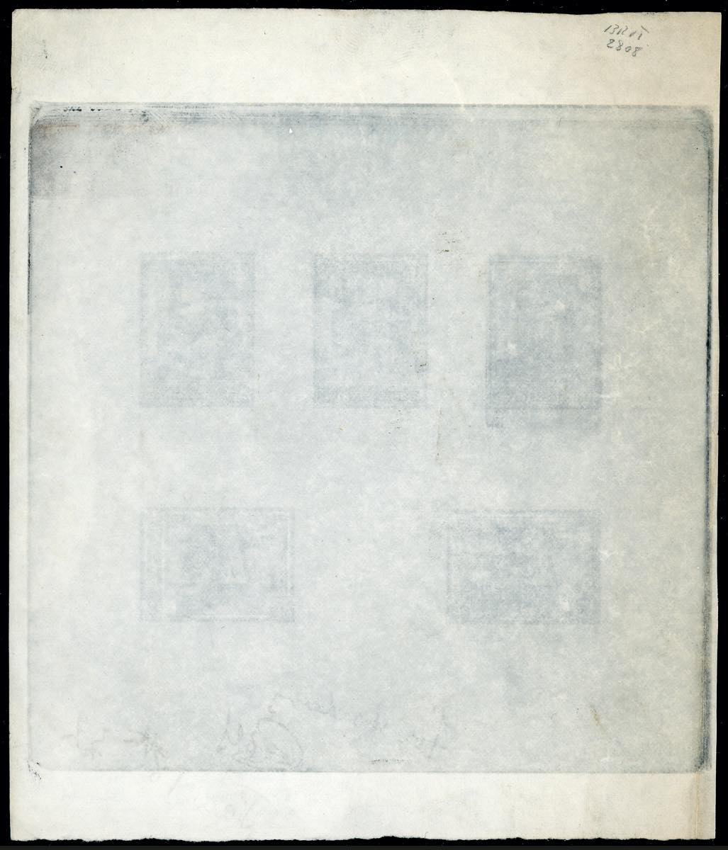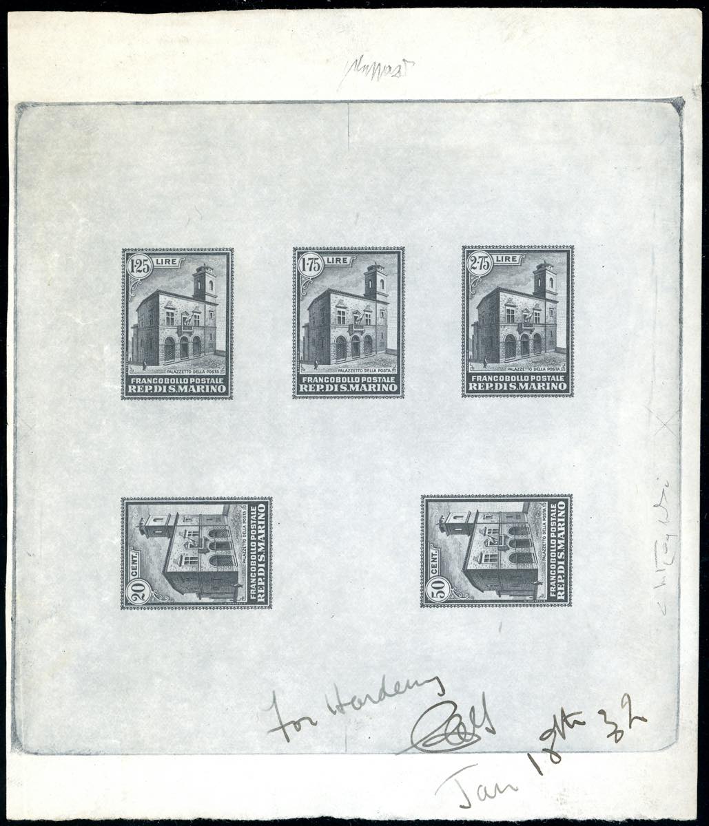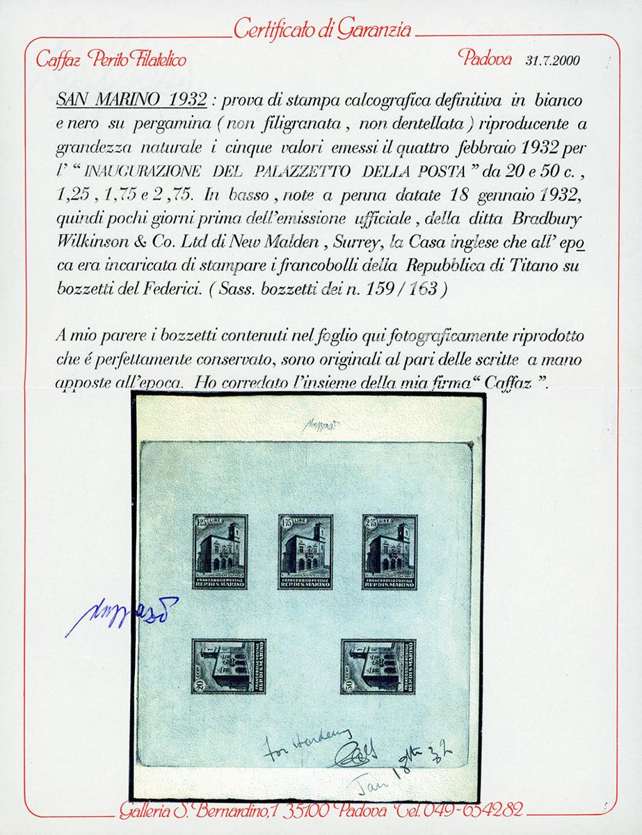 1932 - Palazzetto della Posta, serie completa (159/163), prova di stampa calcografica definitiva in nero su carta pergamino, cm 13,5x15,5, senza gomma, perfetta. In basso sono presenti le note a penna datate 18/1/1932 della stamperia Bradbury Wilkinson & Co., incaricata di stampare i francobolli. INSIEME UNICO e di grande fascino. Dettagliato cert. Caffaz e cert. Oro Raybaudi.