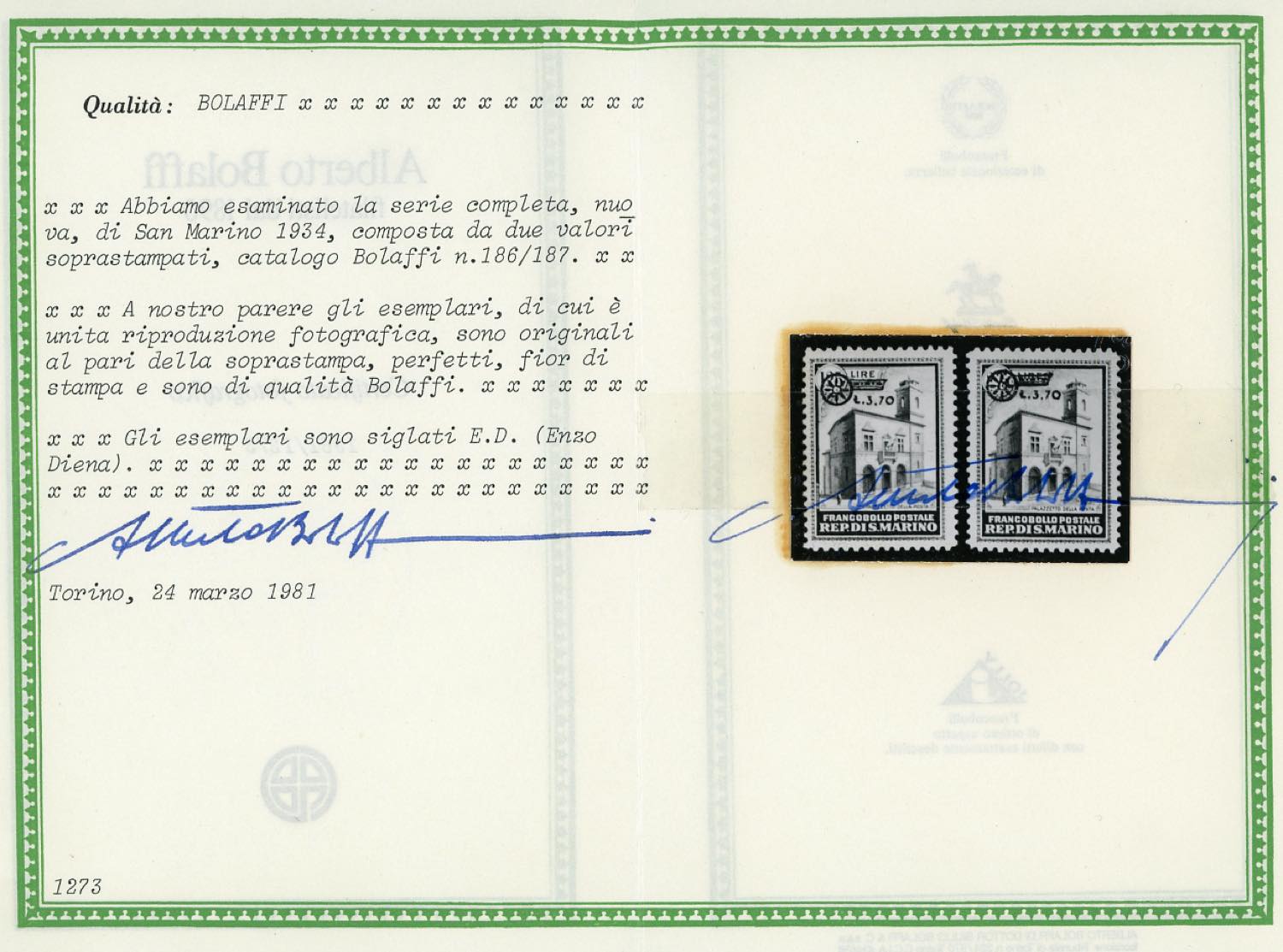 1934 - Palazzetto della Posta soprastampati (184/185), gomma originale integra, perfetti. E.Diena, cert. Bolaffi.