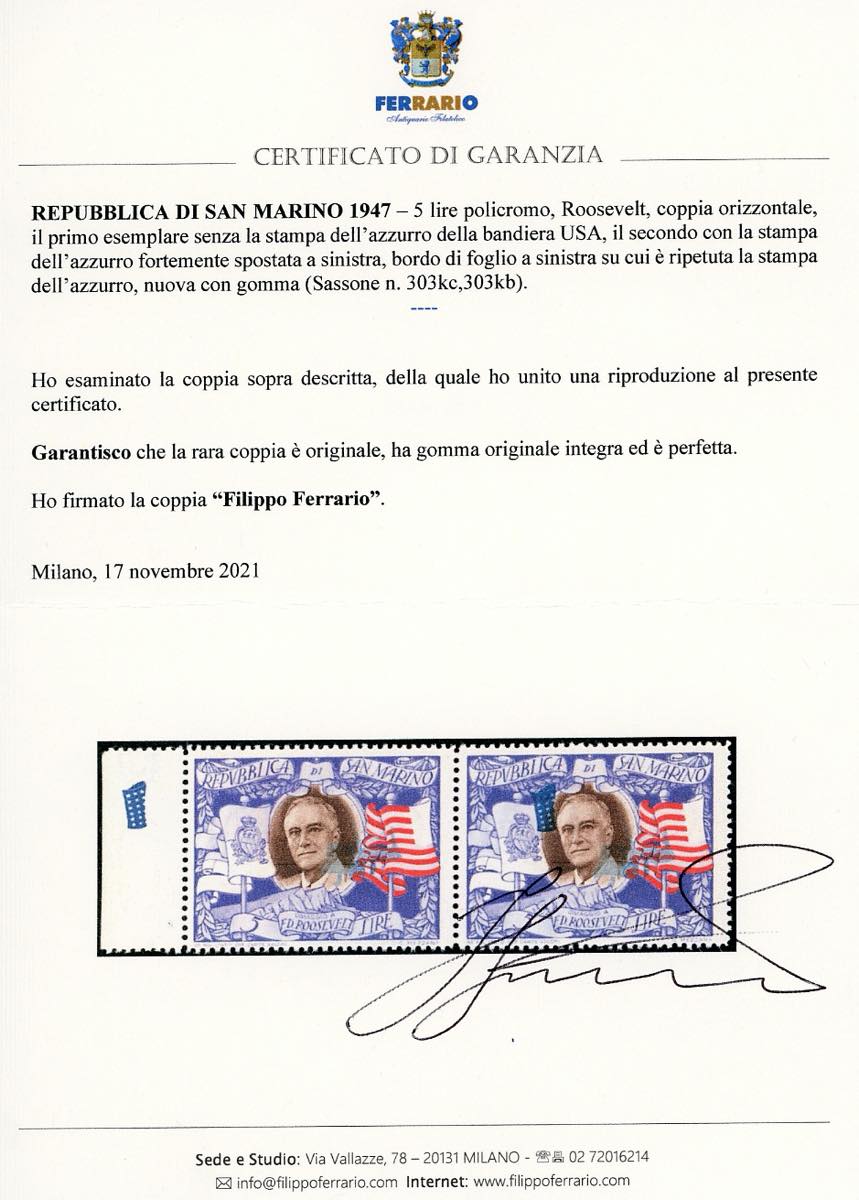 1947 - 5 lire Roosvelt, coppia orizzontale, il primo esemplare senza la stampa dell'azzurro fortemente spostata a sinistra (303Kc,303Kb), bordo di foglio su cui è ripetuta la stampa dell'azzurro, gomma originale integra, perfetta. Bella e rara. Cert. Ferrario.