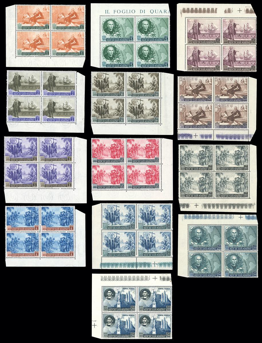 1952 - Colombo, serie completa (372/383+A), blocchi di quattro, angolo di foglio, gomma originale integra, perfetti. Qualità lusso.