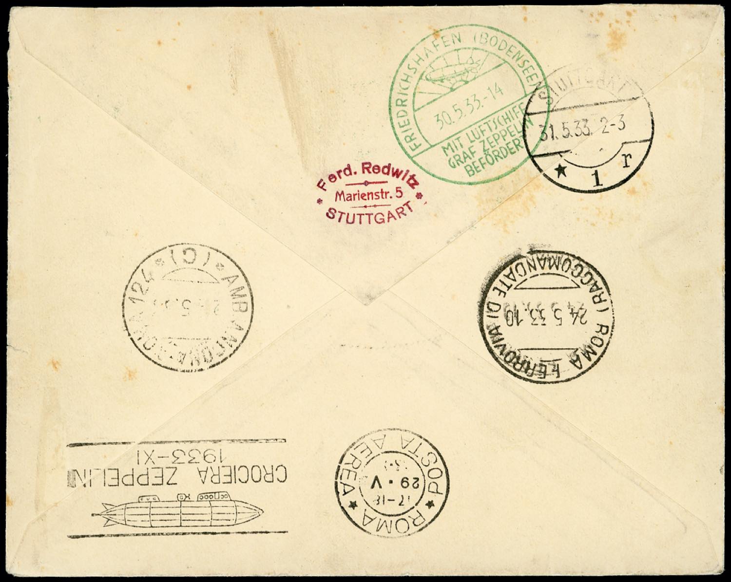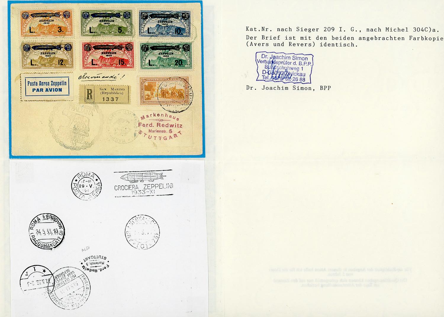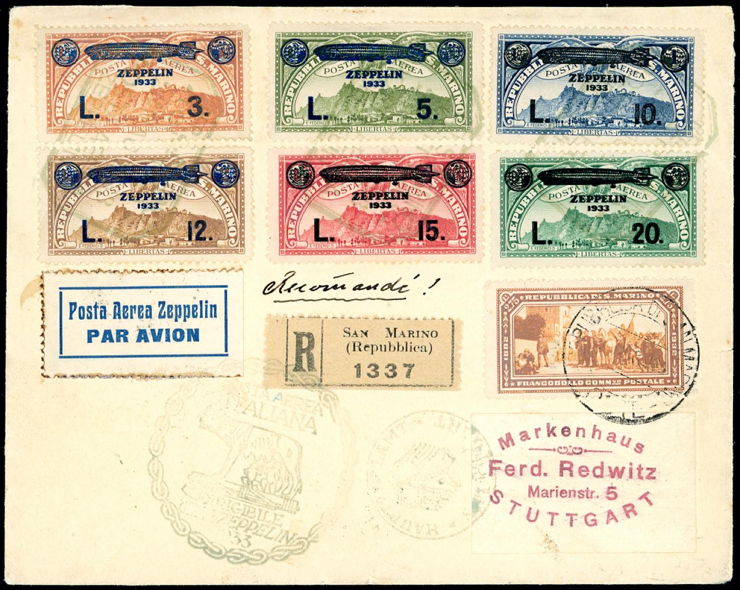 1933 - Zeppelin, serie completa (11/16), con complementare 2,75 lire Garibaldi, perfetti, su aerogramma raccomandato da San Marino ... Leggi tutto