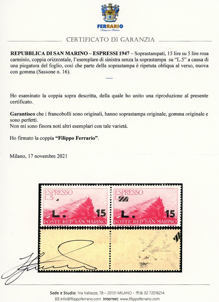 1947 - 15 lire su 5 lire (16), coppia orizzontale, l'esemplare di sinistra senza la soprastampa su "L.5" (a causa di una piegatura del foglio parte della sopratampa è ripetuta obliqua al verso), gomma originale, perfetto. Varietà molto bella, probabilmente unica. Cert. Ferrario.