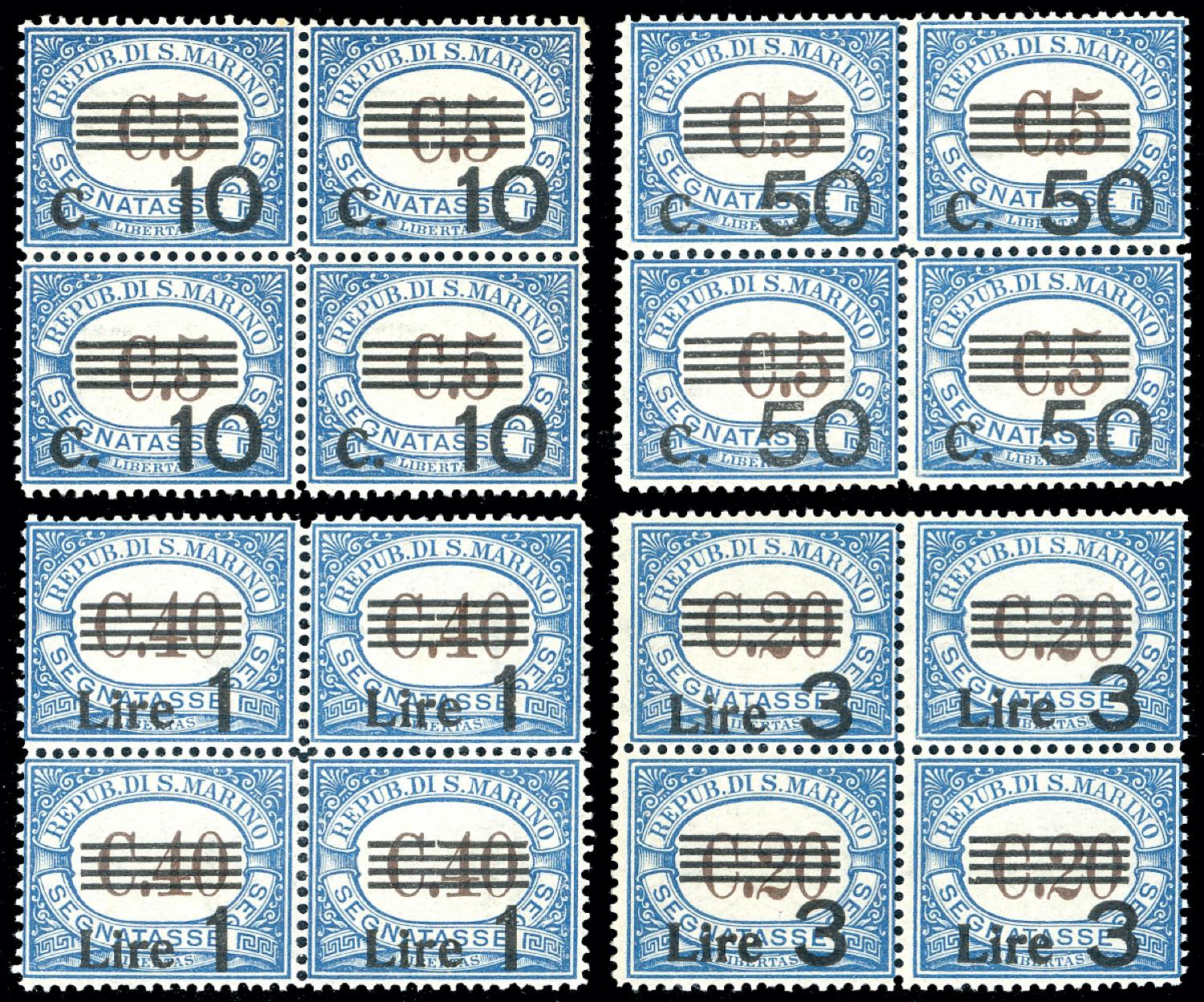 1940 - Soprastampati, serie completa (60/63), blocchi di quattro, gomma originale integra, perfetti e di ottima qualità. Ferrario.