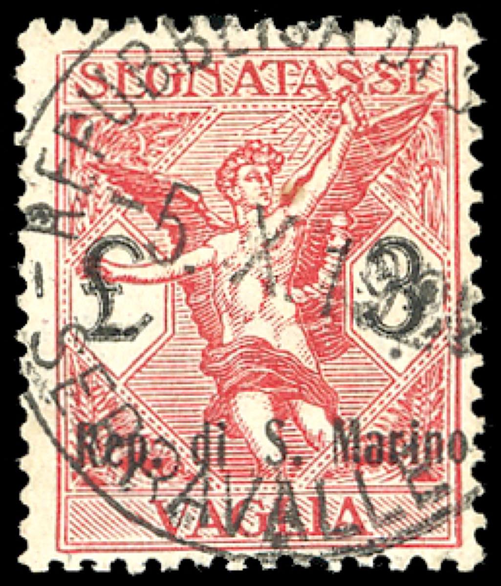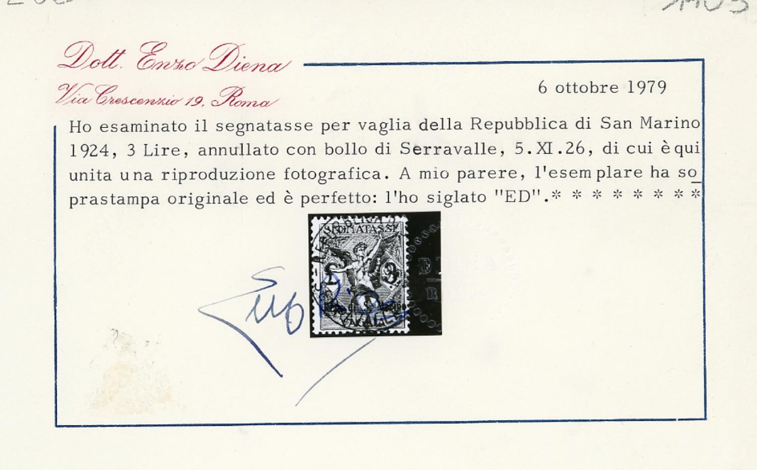 1924 - 3 lire (6), perfetto, usato a Serravalle 5/11/1926. Molto raro così ben centrato. A.Diena, Fiecchi, cert. E.Diena.