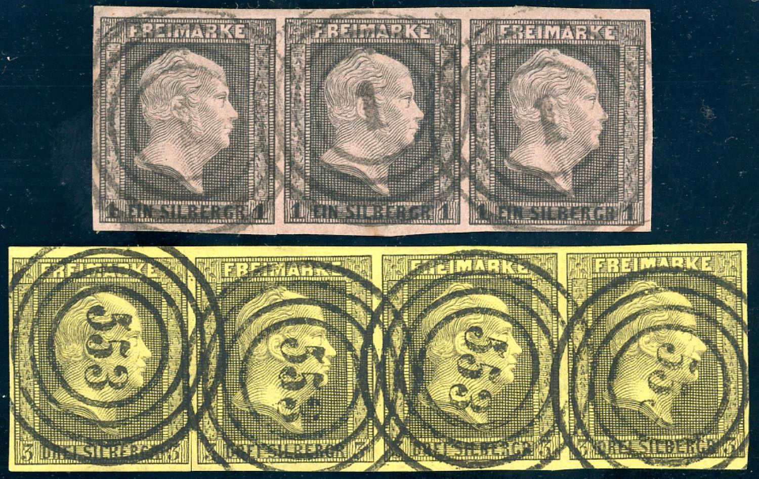 GERMANIA PRUSSIA 1850 - 1 s. nero su rosa, striscia di tre, 3 s. nero su giallo, striscia di quattro (3,5), usate, perfette e ben marginate. Splendide! Entrambe Giulio Bolaffi per esteso.